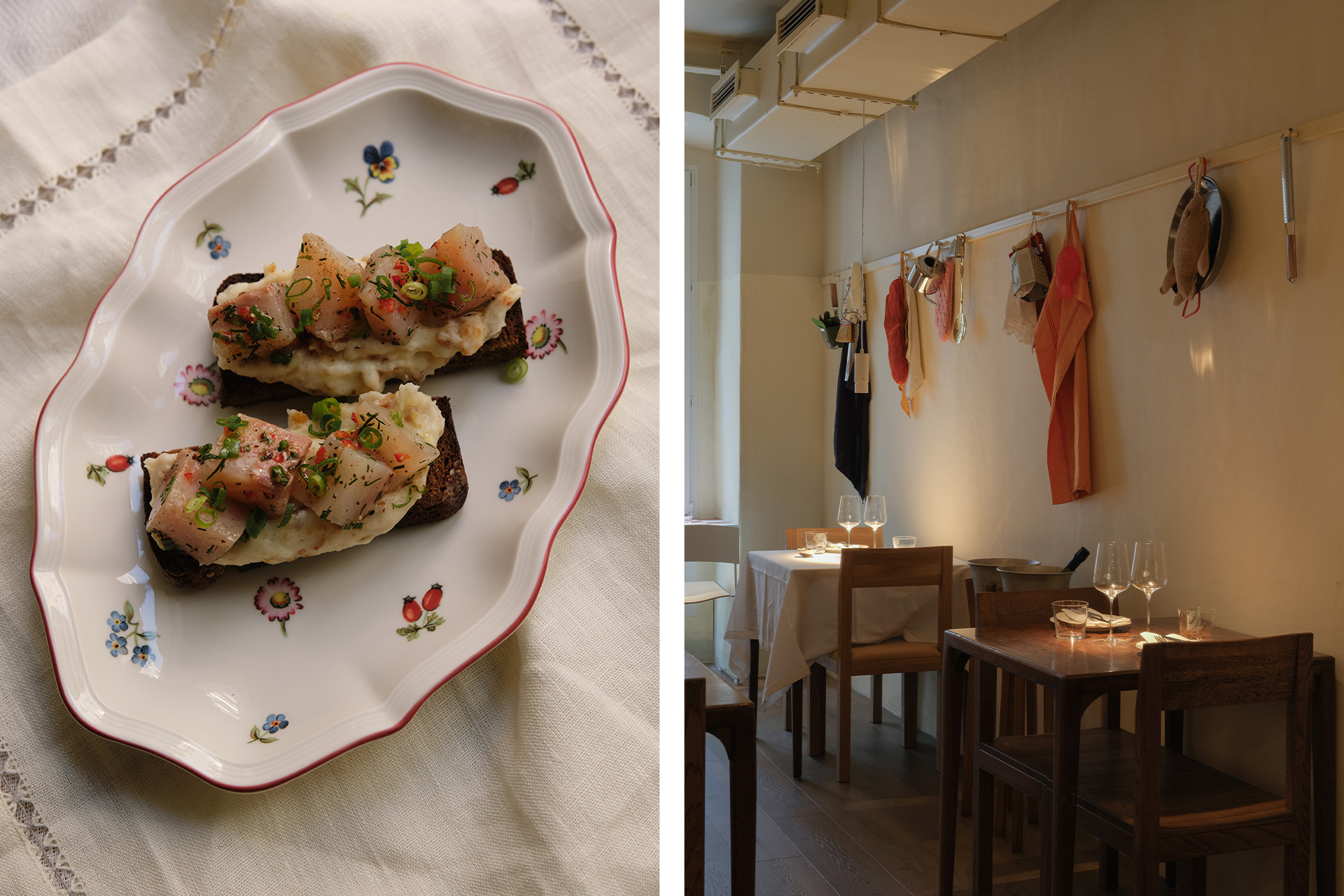 Ресторан от создателей «Публики» на Старой Басманной открылся в исторической усадьбе совсем рядом с высоткой на Котельнической и с прежним составом команды: за кухню отвечает шеф-повар Артём Сипугин, за бар — шеф-бармен Таня Ильина. В «Лолите» очень любят вещи с историей: антикварную посуду, искусство, старинные районы Москвы, поэтому интерьеры бережно восстановили, дополнили милыми деталями, и получилось место с ностальгией по ушедшей эпохе, но с актуальным духом времени!