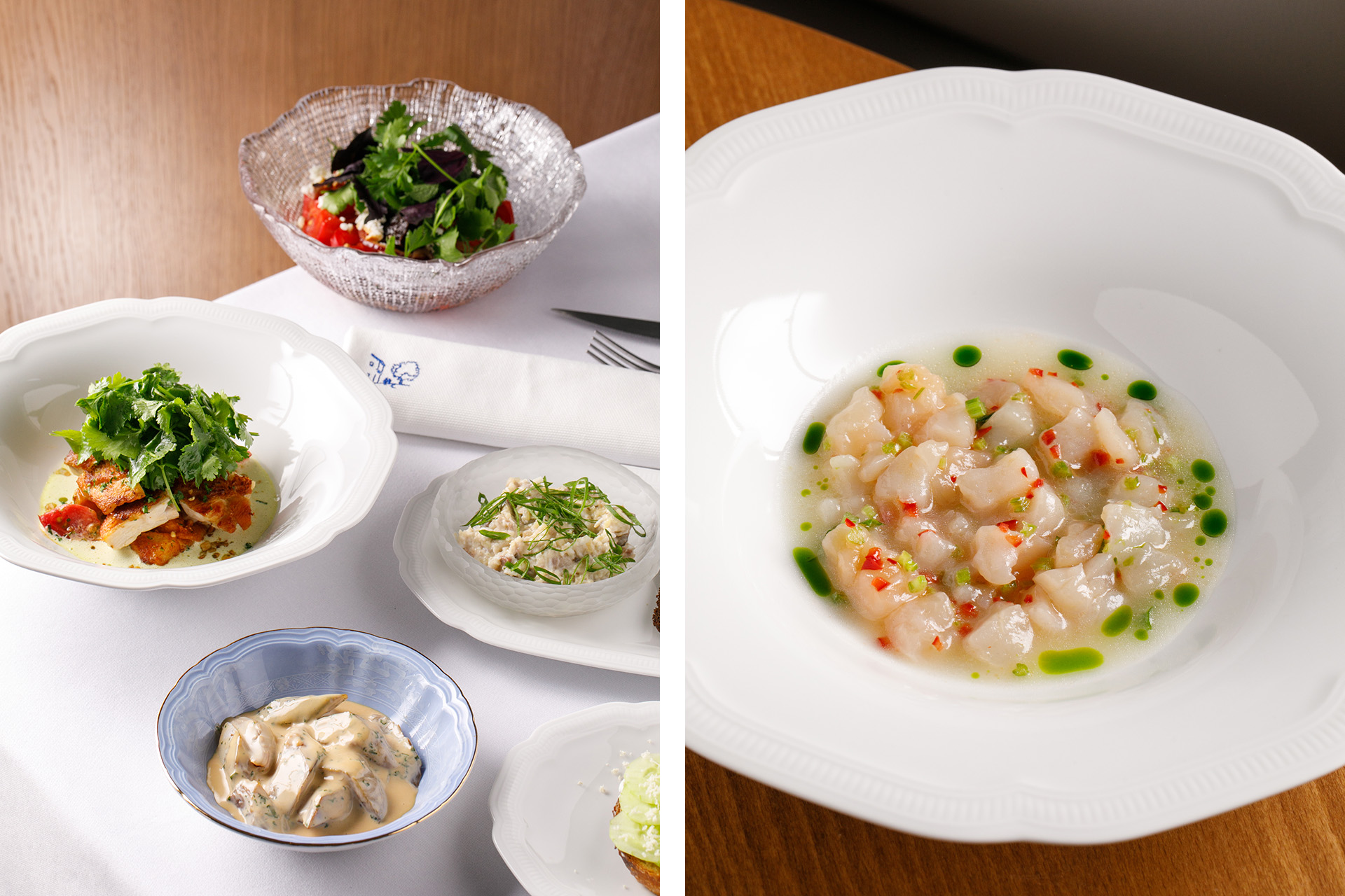 Слева: салат из томатов с молодым сыром и соусом из кваса (сверху), салат с цыплёнком и картофелем (слева), скумбрия холодного копчения с сливочным квасом (снизу) / справа: гребешок c соусом из зелёного крыжовника Фото: «Перемена»