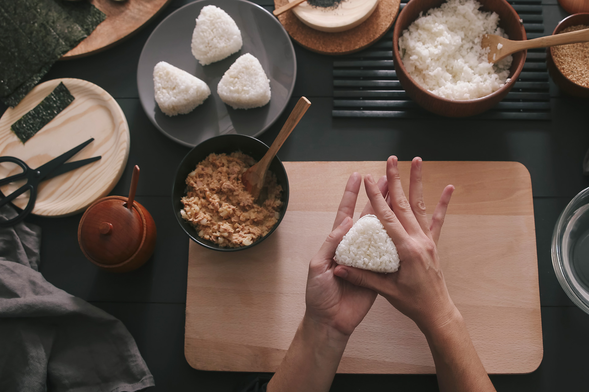 У онигири, однако, идеальной пропорции нет. Владимир Ли предлагает готовить одну порцию из 70 граммов риса и 30 граммов начинки — при таком соотношении начинка будет дополнять рис, а не отодвигать его вкус на второй план (а это важно!).