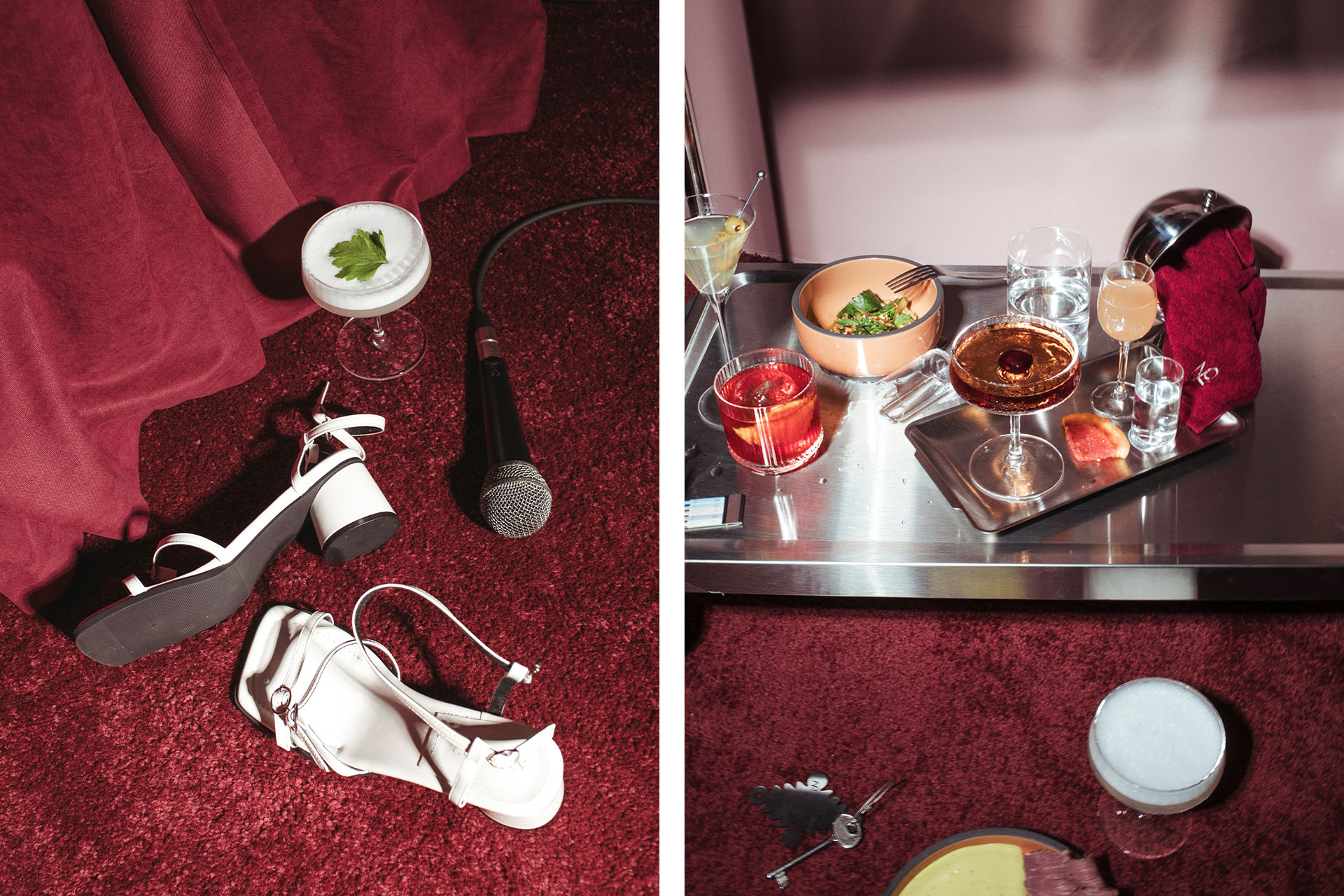 Не просто караоке, а пространство с баром-дистиллерией с атмосферой бутикового отеля, где пять приватных комнат-номеров, общий зал — лобби, бар и стойка ресепшн. Интерьер в эстетике винтажного кино придумала архитектор и художница Майя Рожновская, а художник Саша Посох нарисовал эскизы, по которым изготовили кастомные светильники и панно. Здесь можно петь: всё оборудовано по последнему слову техники и максимально удобно, даже есть различные аранжировки — как популярных песен, так и совсем малоизвестных. А можно пить: в коллекции — 12 дистиллятов, каждый под своим номером, от No1 (грейпфрут, чёрный перец, соль) до No12 (физалис, петрушка, зелёное яблоко). На основе дистиллятов создаются коктейли — это авторские твисты на классику вроде Маргариты, Негрони, Мартини. А для тех, кто хочет попробовать больше, предлагаются дегустационные сеты сразу из трёх напитков. В меню аппетайзеры вроде орешков, битых огурцов, четырёх вариаций сэндвичей сандо, также можно заказать пиццу из соседней skrepka.