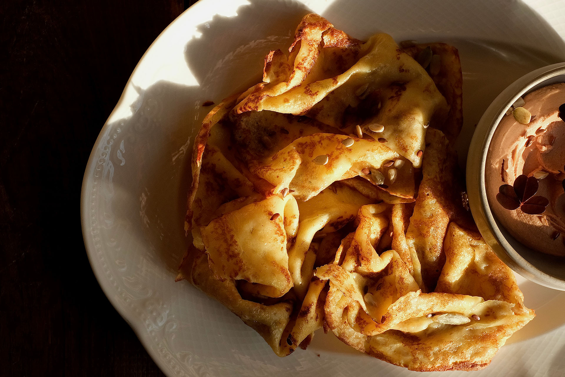 В Angel Cakes на Масленицу действует специальное меню блинов: без глютена и с авангардными — солёными и сладкими начинками. Всего пять вариантов: с грибами и миндальной рикоттой, с красной икрой и греческим йогуртом, с тартаром из лосося и цитрусовым кремом, с индейкой и соусом из рикотты, креп-сюзетт с ванильным мороженым. Хедлайнер — блинный торт «фисташка-матча» без глютена и рафинированного сахара. Это тонкие матча-блины с фисташковым кремом, малиновым соусом и хрустящей начинкой из фисташковой пасты и катаифи.