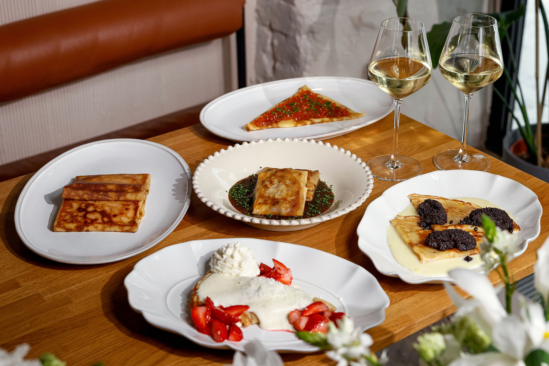 В «Белуге» масленичное меню сразу двух авторов — шеф-повара Романа Чистова и шеф-кондитера Никиты Гавриленко. Пшеничные блинчики с костромскими сырами сервируют с мочёной фейхоа и эспумой из пошехонского сыра. Зелёные блинчики с морской капустой наполнены начинкой из подкопчённой белуги и солёных белых груздей, а для охотников за впечатлениями и просто охотников — блинчики с медвежатиной в сопровождении желе из домашней аджики и пряной зелени. Отдельной строкой — солодовые шанежки, которые укладывают на тарелку слоями, перемежая кремом из слабосолёной форели, и подают с фалангой камчатского краба и свежей красной смородиной. Стоит упомянуть, что блины с чёрной и красной икрой подадут в сопровождении рюмки водки. На десерт — шоколадный блин с кремом «Родные просторы», повторяющим вкус любимых конфет шеф-кондитера, и клубничный блин с припёком, под которым скрываются заварной крем и желе из клубники с красной смородиной.