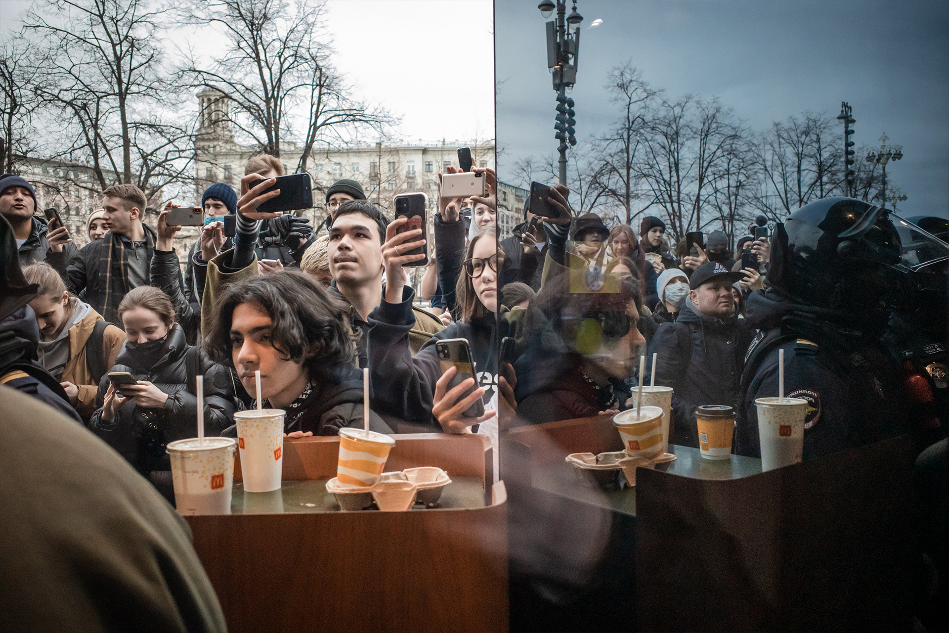 Минут через пять после начала этой акции со стороны Пушкинской площади подходят сразу шесть сотрудников полиции. Со стороны сквера у дверей ресторана собираются люди, среди них много журналистов, быстро образуется толпа. В кафе за полупрозрачной стеной из черного стекла видны лица многочисленных посетителей «Макдоналдса». Они продолжают есть и следят за происходящим без особого интереса.