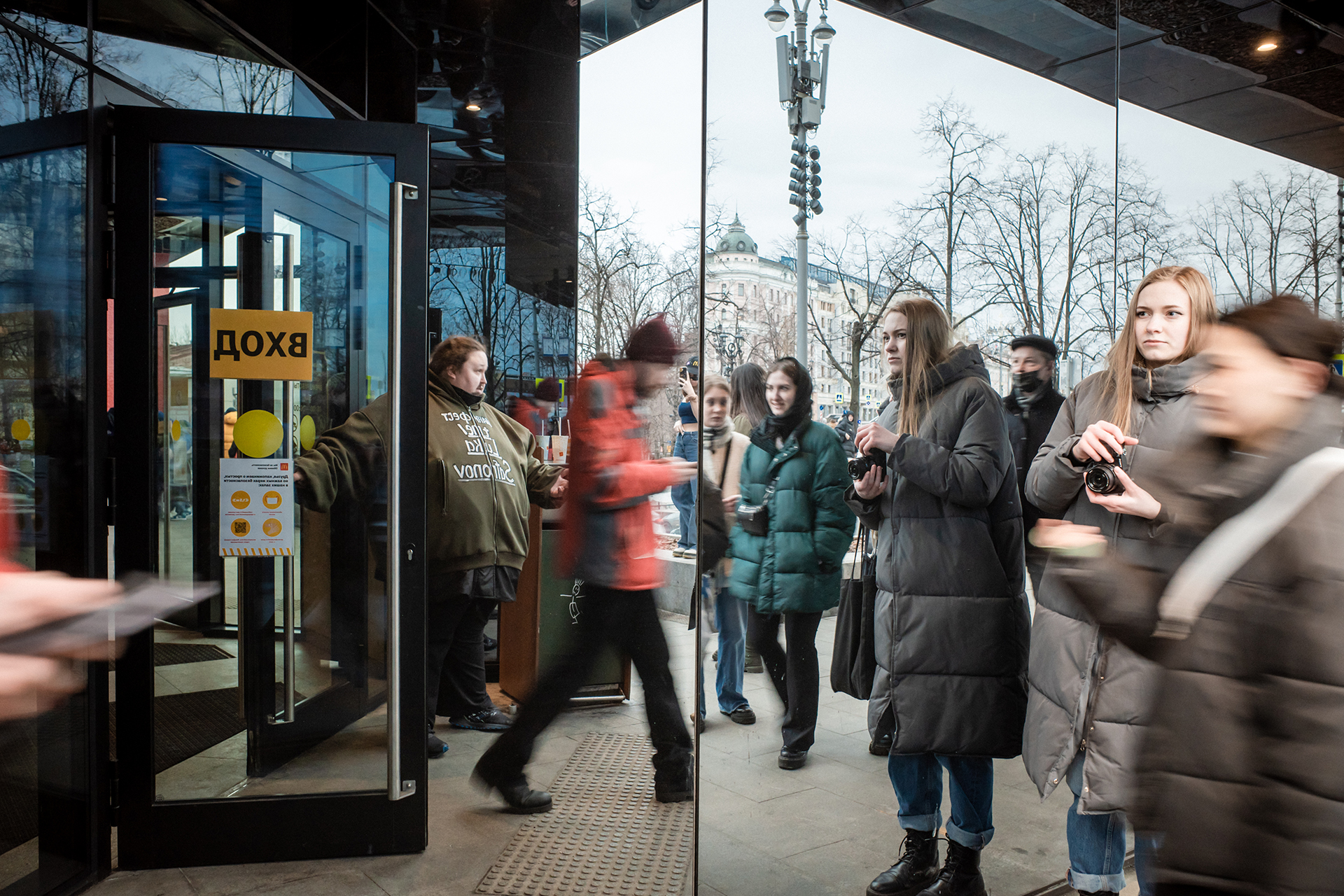 В центре зала менеджер кафе в белой рубашке с вытянутых вверх рук фотографирует толпу у входа. На вопрос, откроется ли кафе снова, она твердо отвечает: «Да». Нужно только найти замену импортным продуктам — кофе, соусам. Но таких позиций немного, говорит девушка, в основном все отечественное. Она спешно уходит, явно желая поскорее закончить разговор.