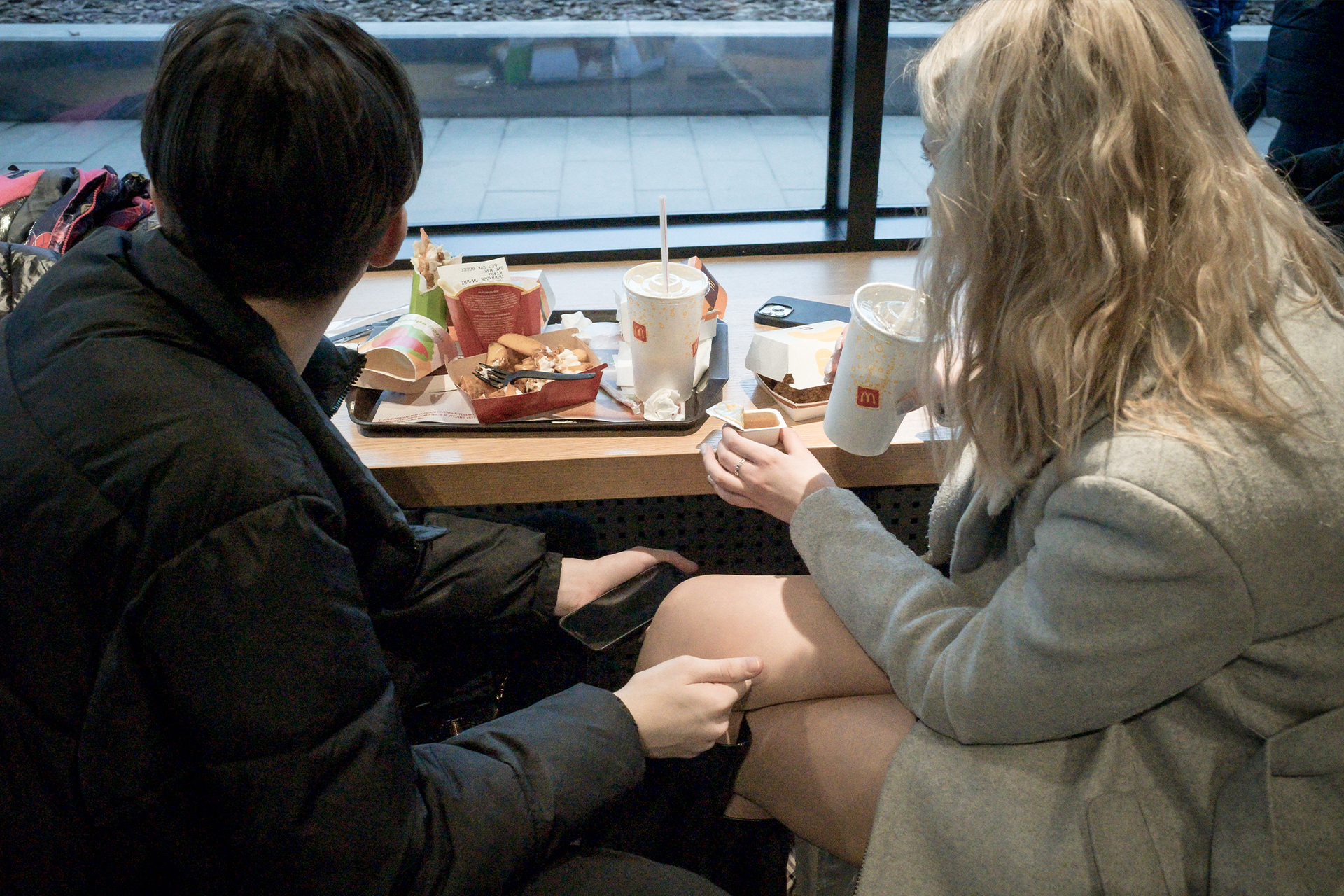 Рядом с зоной выдачи заказов стоит пара, молодой человек и девушка лет 25. У нее ярко-желтые волосы, на голове черная бейсболка. Грудь парня пересекает черный ремень небольшой кожаной сумки, на лице очки сложной формы, губы блестят от гигиенической помады. Оба улыбаются. Спрашиваю, связан ли их визит в «Макдоналдс» с закрытием сети. Оба кивают.