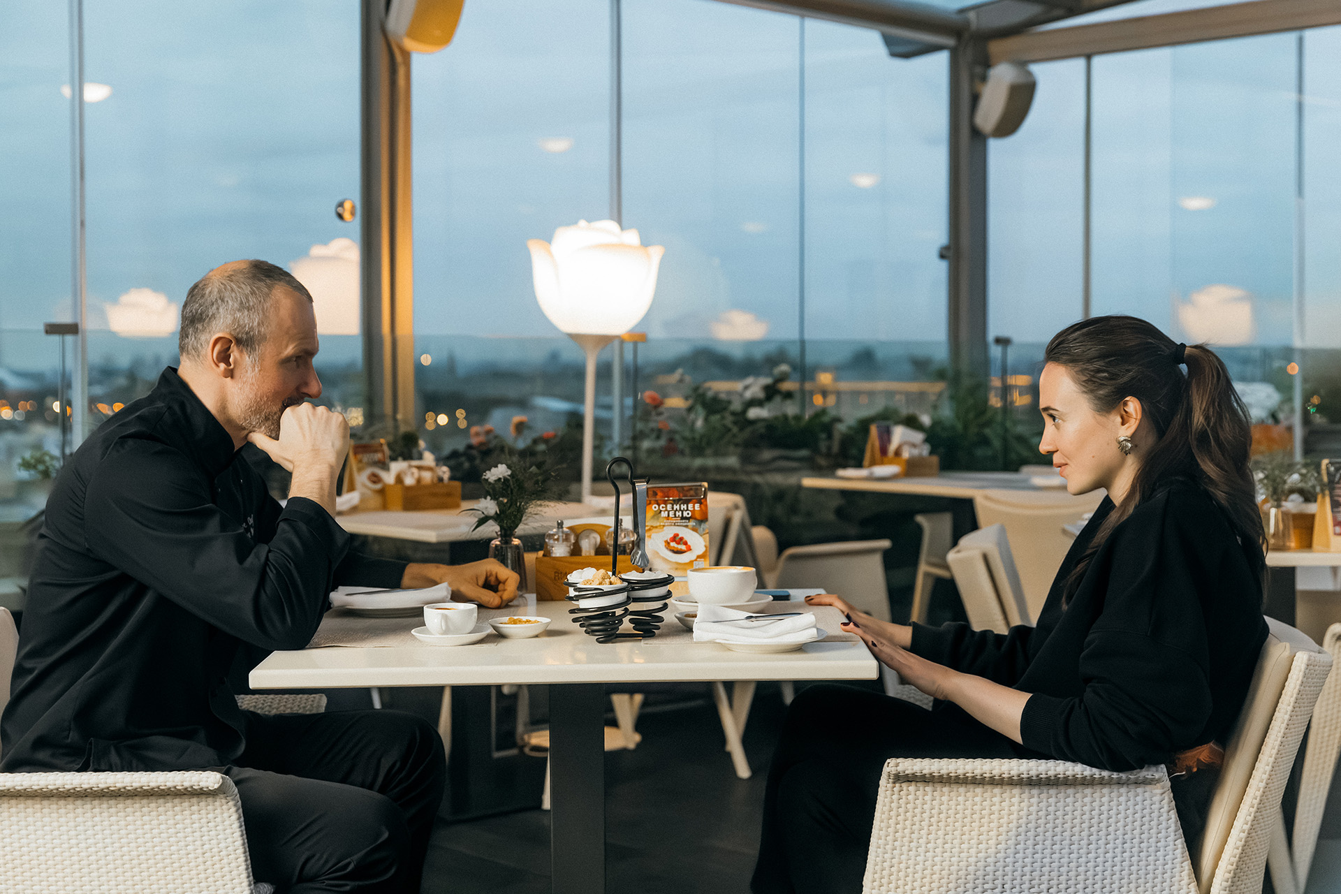 При отеле открыты «Афиша бар» и основной ресторан «Вино и Вода». «Афиша бар» — комфортное место, где удобно встретиться, пообщаться, выпить кофе, быстро пообедать или поужинать. «Вино и Вода» — ресторан авторской кухни. Во время низкого сезона он занимает пространство просторного атриума, сквозь его стеклянную крышу видно небо. А по утрам здесь всегда подают завтраки. У нас есть и малый атриум, где проходят различные мероприятия. Обе локации напоминают дворы-колодцы Питера (кстати, я родился на Васильевском острове, моё детство прошло в подобном дворе). С апреля по октябрь ресторан переезжает на террасу на крыше отеля. Наши гости особенно любят её за открывающийся вид на город — отсюда весь Петербург как на ладони. На террасе, а также на других площадках отеля часто проходят свадьбы, дни рождения, корпоративные мероприятия. Форматы разные: банкеты, фуршеты, деловые завтраки. А ещё мы проводим винные ужины с различными винными компаниями.