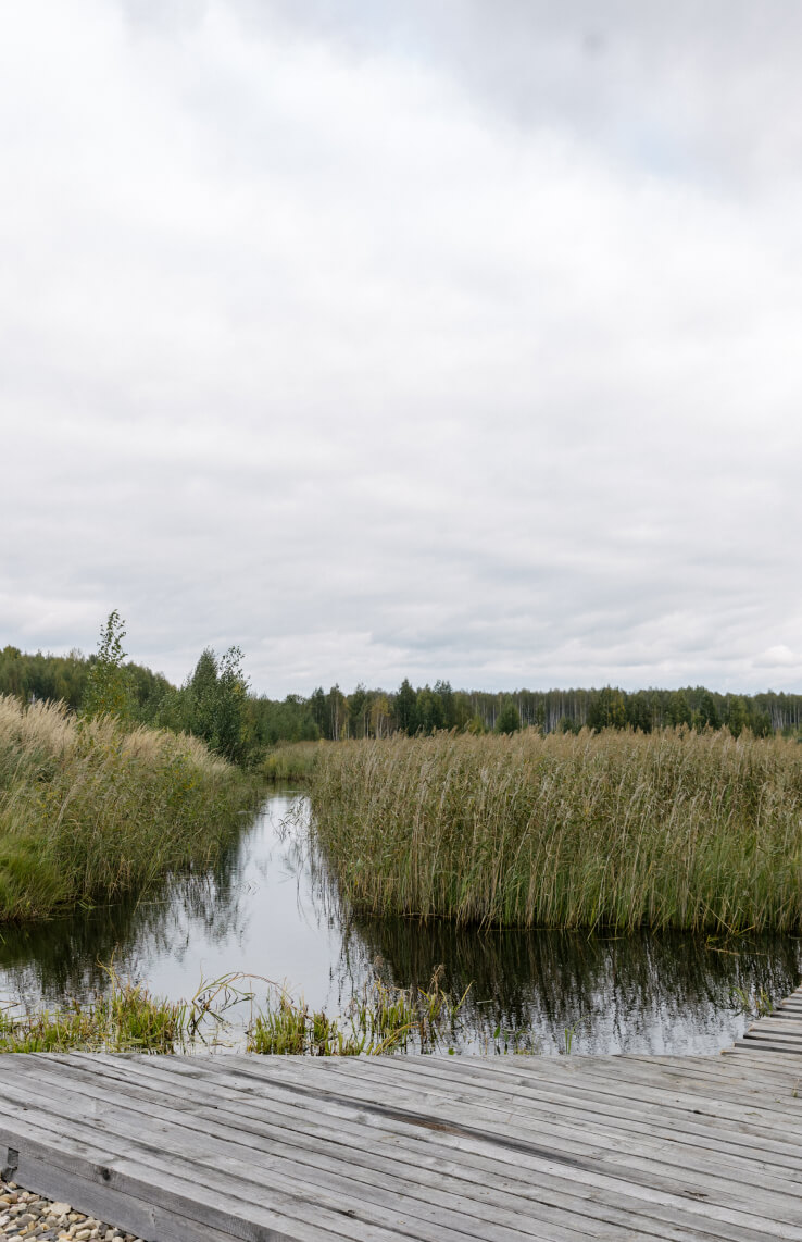 Мы высадились из машины и увидели огромное пространство, окруженное осенним лесом. И это был тот самый момент «ожидание — реальность». По пути мы с командой обсуждали, как будем делать фото на фоне бескрайних красных плантаций клюквы — лавандовые поля по-костромски! А встретила нас абсолютно черная-черная земля. И, удивительное дело, реальность оказалась куда эффектней наших ожиданий.