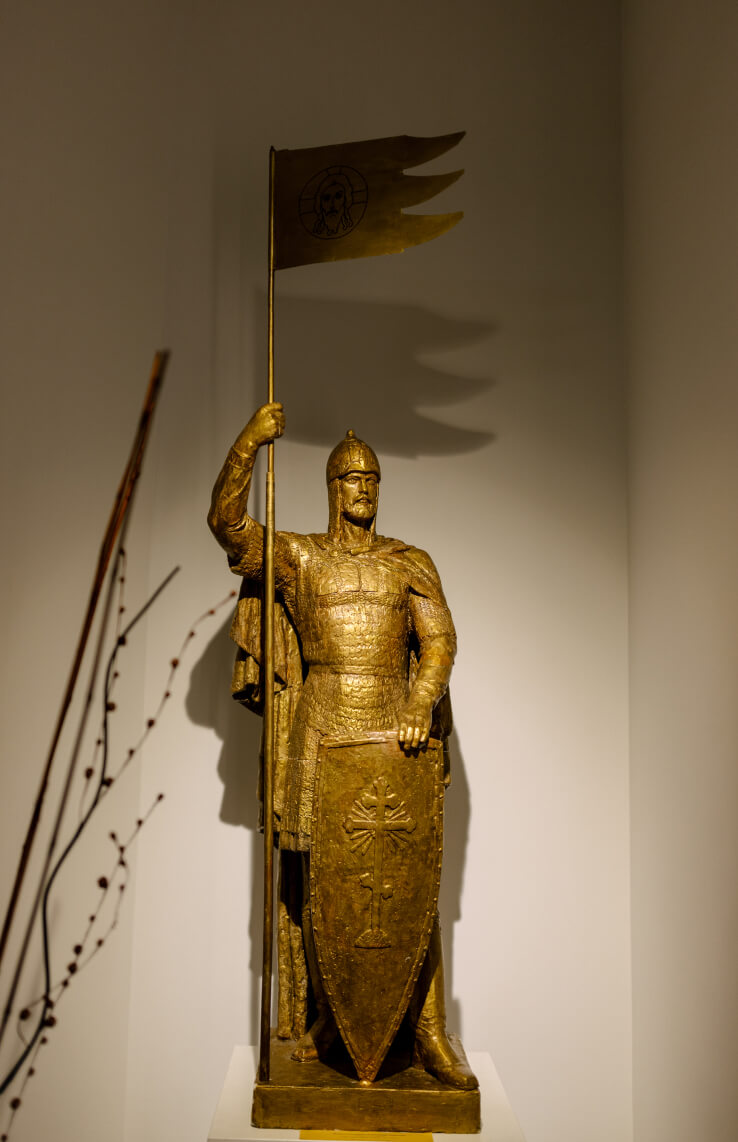 От ансамбля «Города мастеров» мы возвращаемся к музейной аллее. По крутой лестнице с правой стороны наша команда неспешно поднимается, подняв голову вверх, — разглядываем памятник князю Александру Невскому. В одной его руке реет флаг, в другой лежит щит. Именно в Городце в 1263 году полководец умер после долгой болезни. Эта историческая фигура, наравне с рукоделием и промыслом, — важная веха в хронике города. Поэтому в одном из купеческих домов Музейного квартала решили сделать экспозицию, посвященную археологическим находкам в городе и его окрестностях и самому князю.