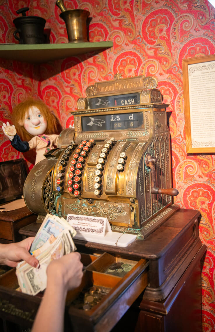 Сначала заглядываем внутрь пестрого деревянного дома — фасад «Галереи добра» выкрашен насыщенным синим цветом, на окнах резные белые наличники. Экспозиция состоит в основном из старинных предметов быта, по которым просто понять, как раньше жили люди. На полках соседствуют причудливые кувшины, маленькие баяны, медная посуда, оригинальные дверные ручки и замки, прялки, кухонная утварь и даже старинные купюры. Нам особенно приглянулась симпатичная коллекция изразцов, созданная руками городецких умельцев. А также уникальный кассовый аппарат — он по-прежнему работает, рассчитывает сумму внесенных наличных и выдает сдачу, но чека ждать не стоит.