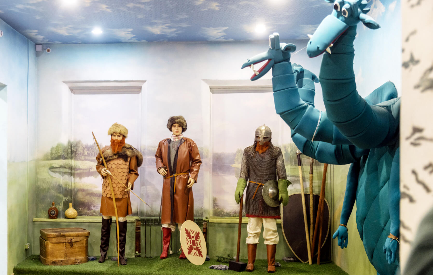 Все персонажи сказок выставлены в музее в виде скульптур в полный рост — они выглядят немного детскими, но тем не менее здорово передают колорит и сюжетные детали. Можно увидеть и того самого Водяного, и красавицу Пампалче, а еще марийских богатырей и Змея-Горыныча, которого в марийских сказках зовут Аждага.