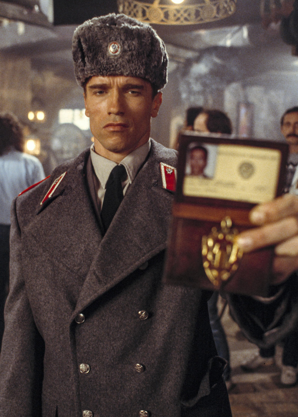 Картину, которая в очередной раз закрепила за русскими образ суровых малых, стоит посмотреть хотя бы ради кадров Шварценеггера на Красной площади. Они снимались на ручную камеру — команда не смогла получить разрешение на официальные съемки. Из других интересных фактов: ради роли Шварценеггер выучил русский язык и похудел на несколько килограммов. А во время визита в Москву исполнил давнюю мечту — встретился с русским тяжелоатлетом Юрием Власовым, которого впервые увидел, еще когда жил в Австрии и занимался бодибилдингом.