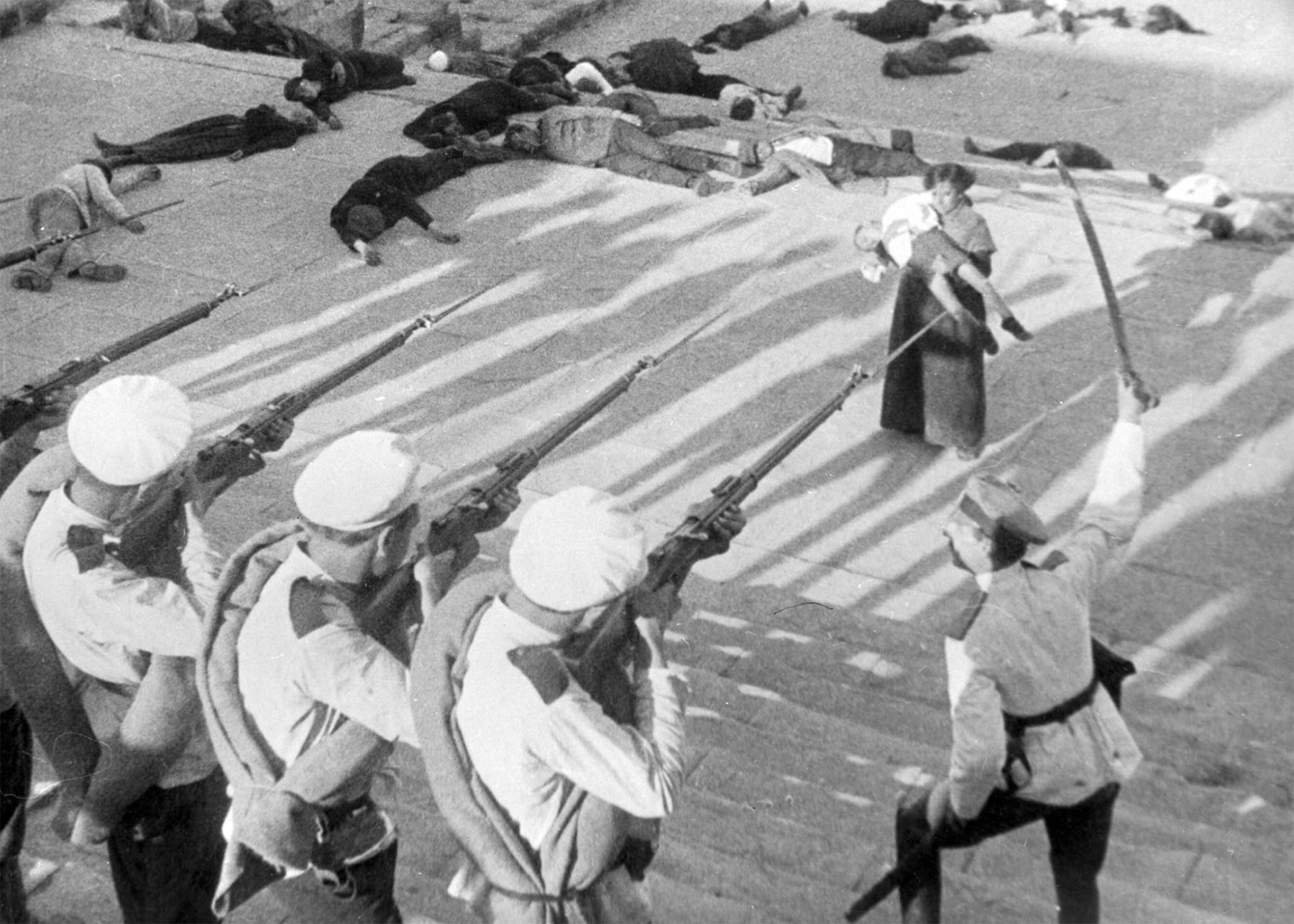 То же касается растоптанных людей на лестнице — много и долго говорили о том, что режиссёр проявлял на съёмках жестокость, оправдывая её поисками реализма: солдаты должны были по-настоящему наступать на руки, головы и туловища людей сапогами. Но нет. Сохранились фотографии, на которых видно, что наступающий в момент съёмки держался за специальную перекладину, а уже при монтаже автор создавал страшную иллюзию давки.
