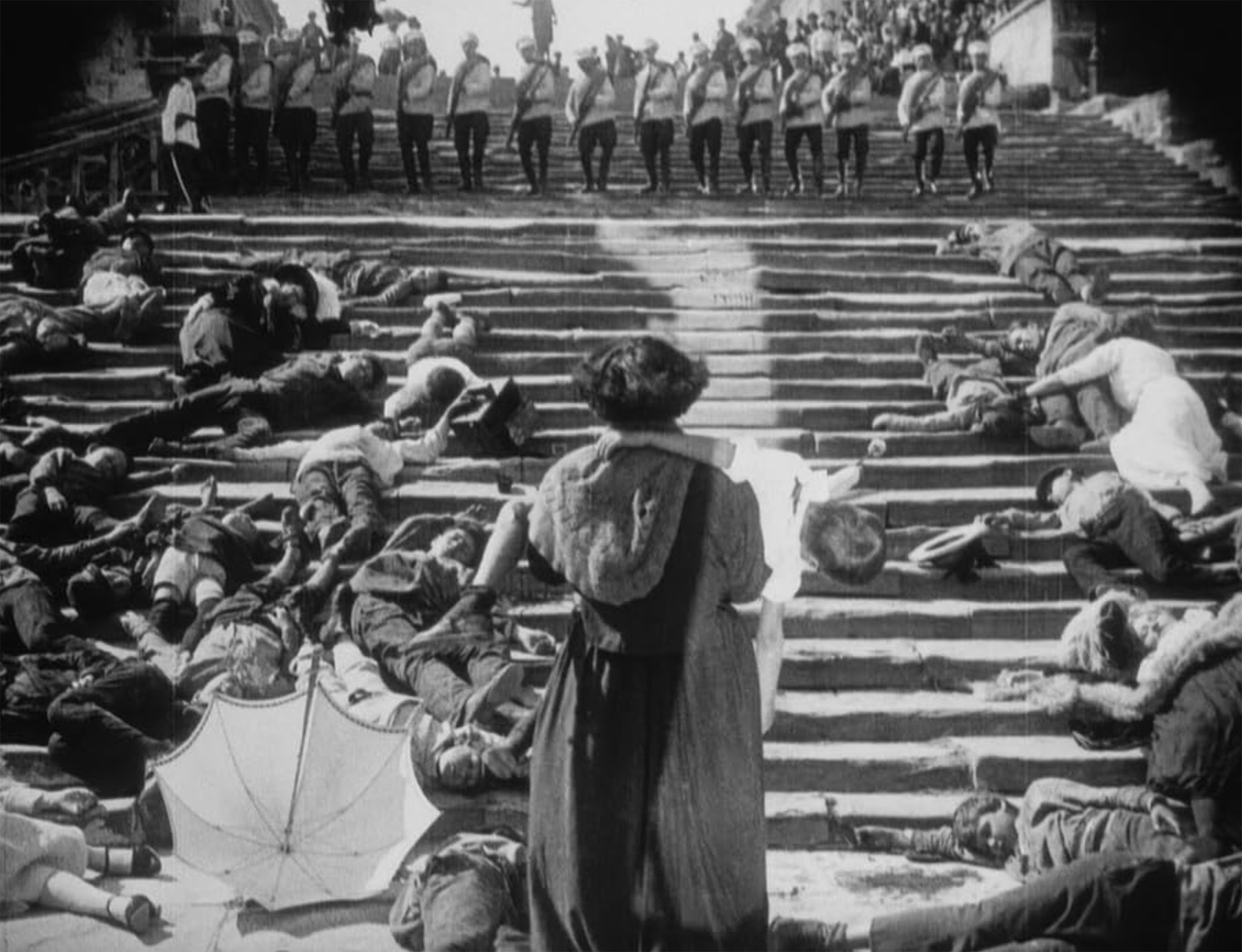И тут надо отметить, что сколько бы раз я ни видел сцену несостоявшегося расстрела матросов на палубе, я не могу сдержать внутреннего негодования и волнения, будто бы не знаю, чем кончится. Это признанное мастерство Эйзенштейна — снимать и монтировать так, чтобы вовлекать зрителя в действие мгновенно, оставляя в напряжении до самого конца. Вы ведь тоже знаете, что коляска с младенцем, которая катится по Одесской лестнице в третьей части фильма, не переворачивается? В общем, мы же можем предположить, что с ребёнком всё в порядке, никакой трагедии не произошло. И тем не менее это, вероятно, самая драматичная сцена в мировом кинематографе — вот коляска катится, прыгает по ступеням, сердце зрителя замирает, он видит, что коляска вот-вот опрокинется, младенец вылетит из неё прямо на ступени! Но кадр обрывается, мы видим кричащую пожилую женщину, которая не имеет отношения к коляске, — это уже другой микросюжет полотна. И тем не менее мы за сто лет так и не отделались от ощущения, что видели падение детской коляски. Это Эйзенштейн заставил наше воображение дорисовать трагедию, которую сам не стал изображать.