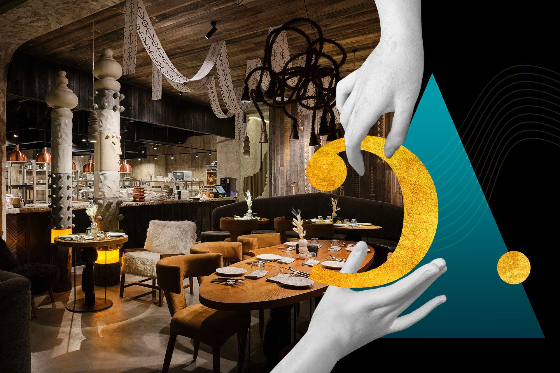 За интерьер отвечала команда «100 Проектов». Он вдохновлён сибирской природой: дерево, состаренная штукатурка, мягкий текстиль в природной палитре. Главный акцент первого зала — монументальные колонны-идолы, символы силы и духов, вылепленные вручную и подсвеченные изнутри. Центр второго зала — очаг, вручную сложенный из камня.