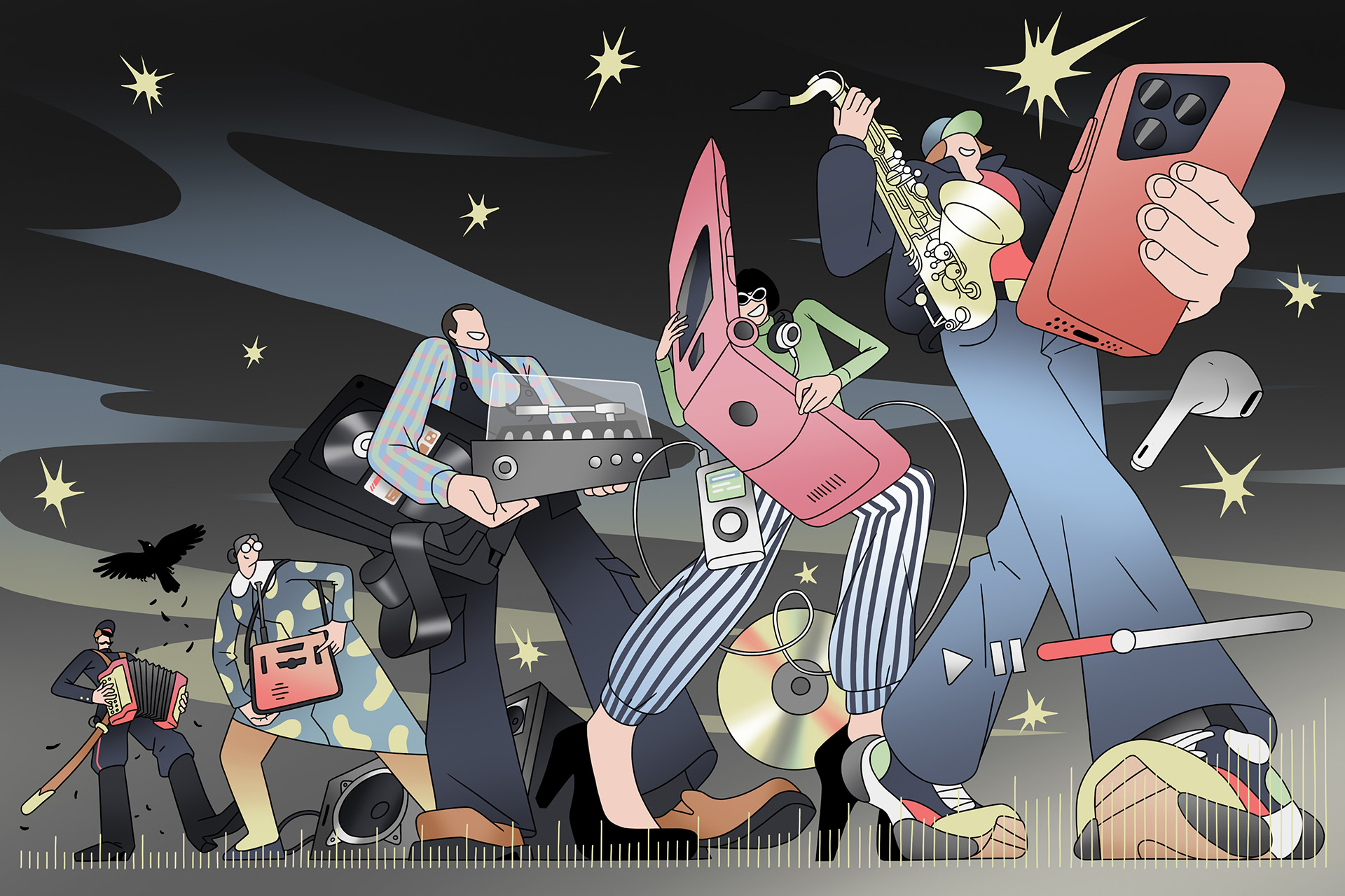 Для старших поколений, с моей точки зрения, социальные функции музыки формировались не как акт протеста, а как следствие ограниченного доступа к музыкальным ресурсам. В этой сфере наиболее радикально изменилась как раз доступность контента. Еще в начале 1980-х зарубежные пластинки были дефицитом, их цена могла достигать половины зарплаты, для их копирования были нужны катушечные магнитофоны. Позже появились кассетные носители, хотя поиск и приобретение музыки оставались непростой задачей. Прорыв произошел в нулевых с появлением MP3-формата, а в 2010-х распространение мобильного интернета сделало музыку почти неограниченно доступной. К 2020-м годам доступность достигла такого уровня, что основной проблемой стало не «добывание» музыки, а навигация в ее безграничном ассортименте.