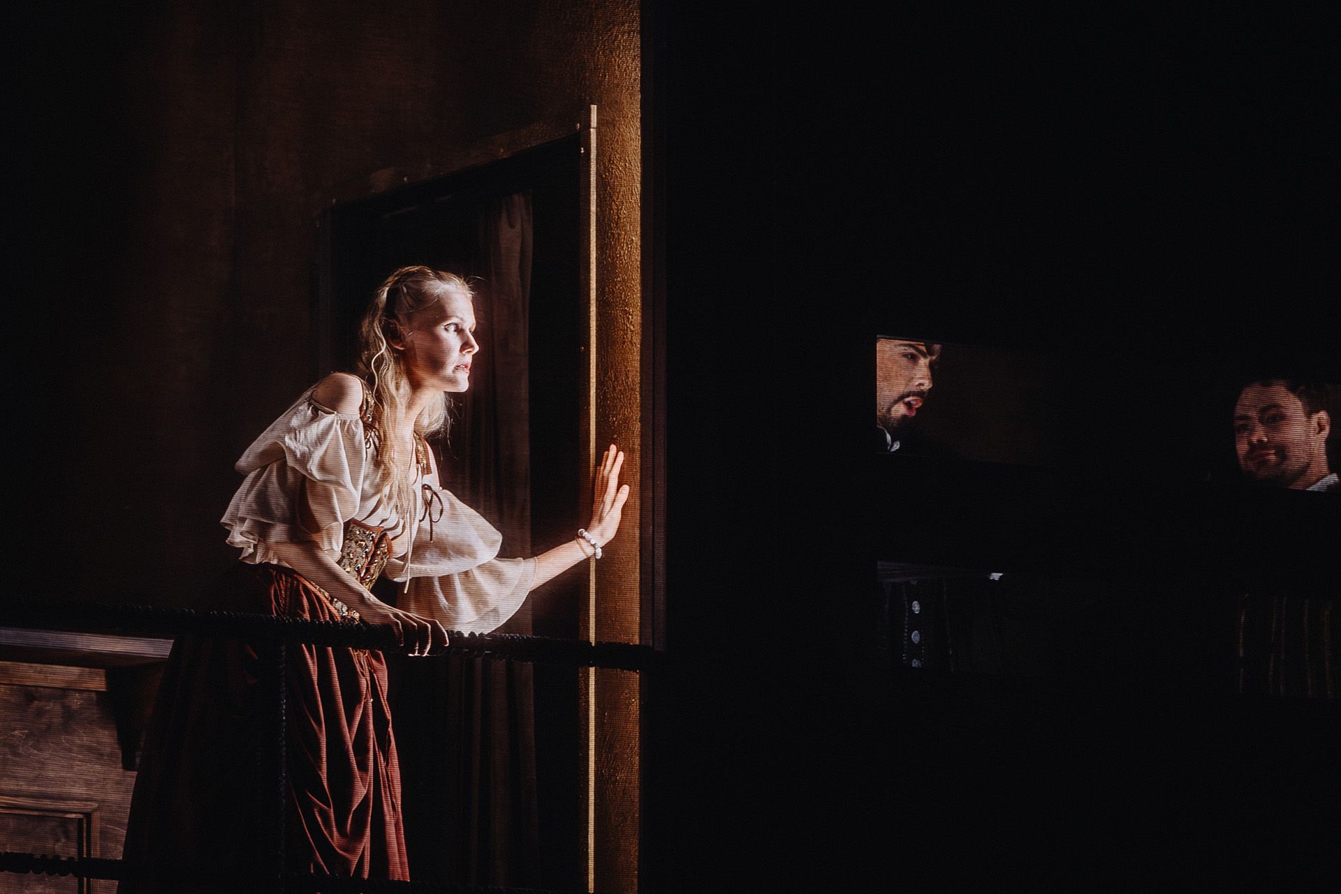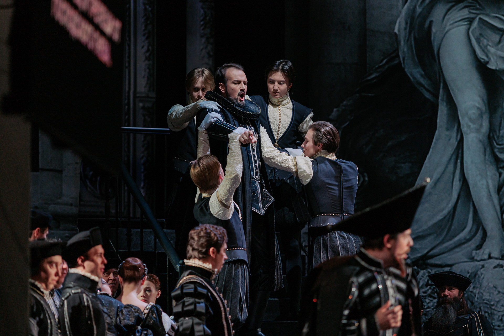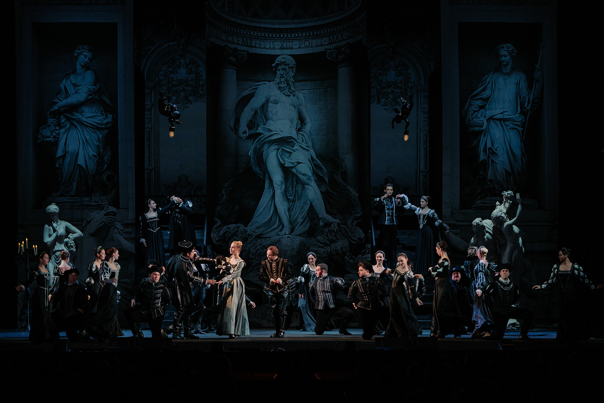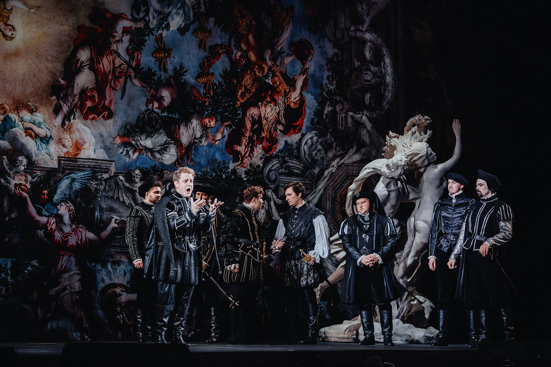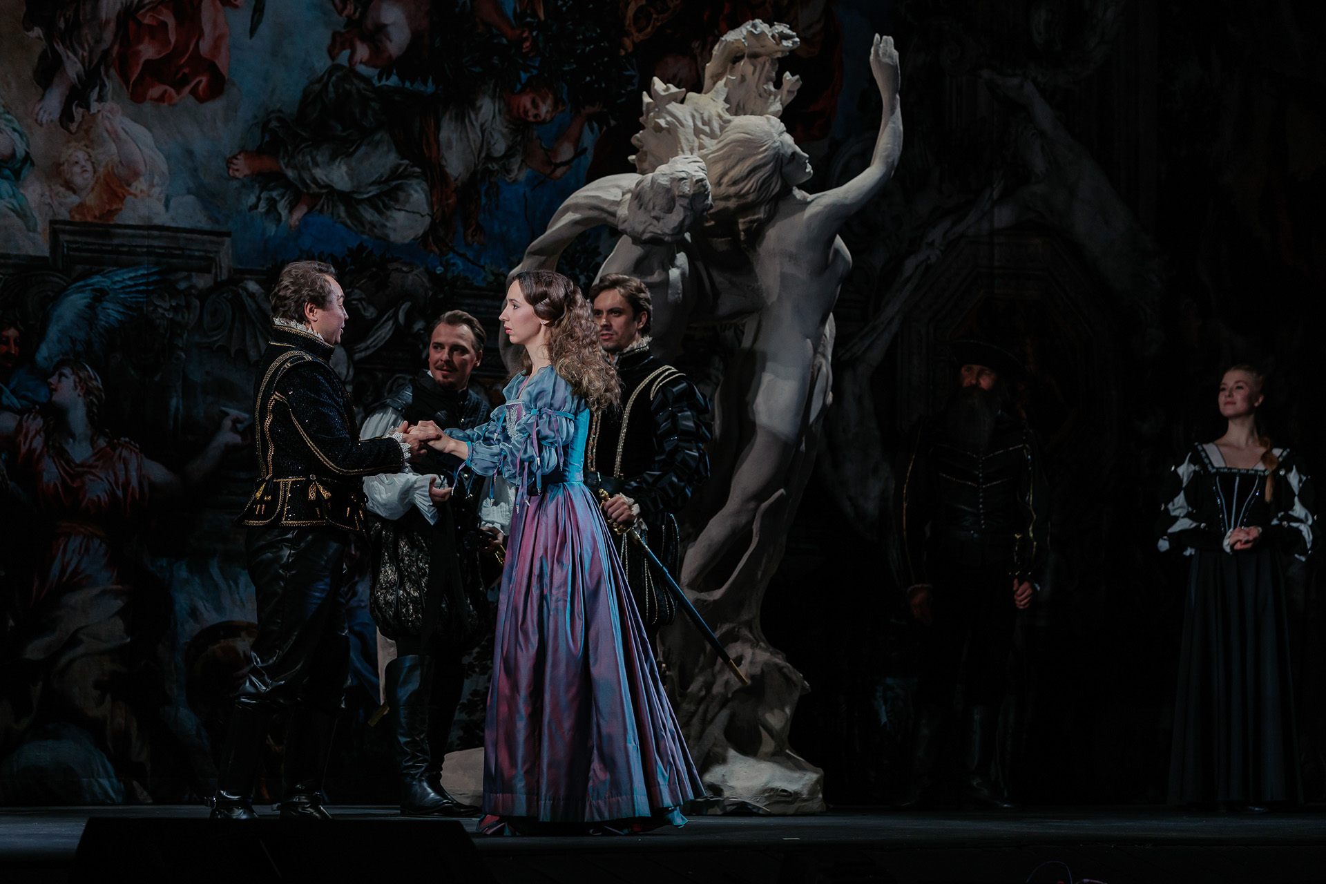 На фоне впечатляющих декораций сольные номера смотрелись поистине ярко, как эстрадные выходы на сцену, а вот в массовых сценах постановка местами снижала пафос до бутафорских танцев и заигрывания с историей. Хору, в отличие от предыдущей премьеры театра («Сказки Гофмана» Оффенбаха в постановке Елизаветы Мороз), в этом спектакле уделено меньше внимания, однако в нескольких номерах можно было развернуться. Например, мужской ансамбль блестяще справился с Zitti, zitti…