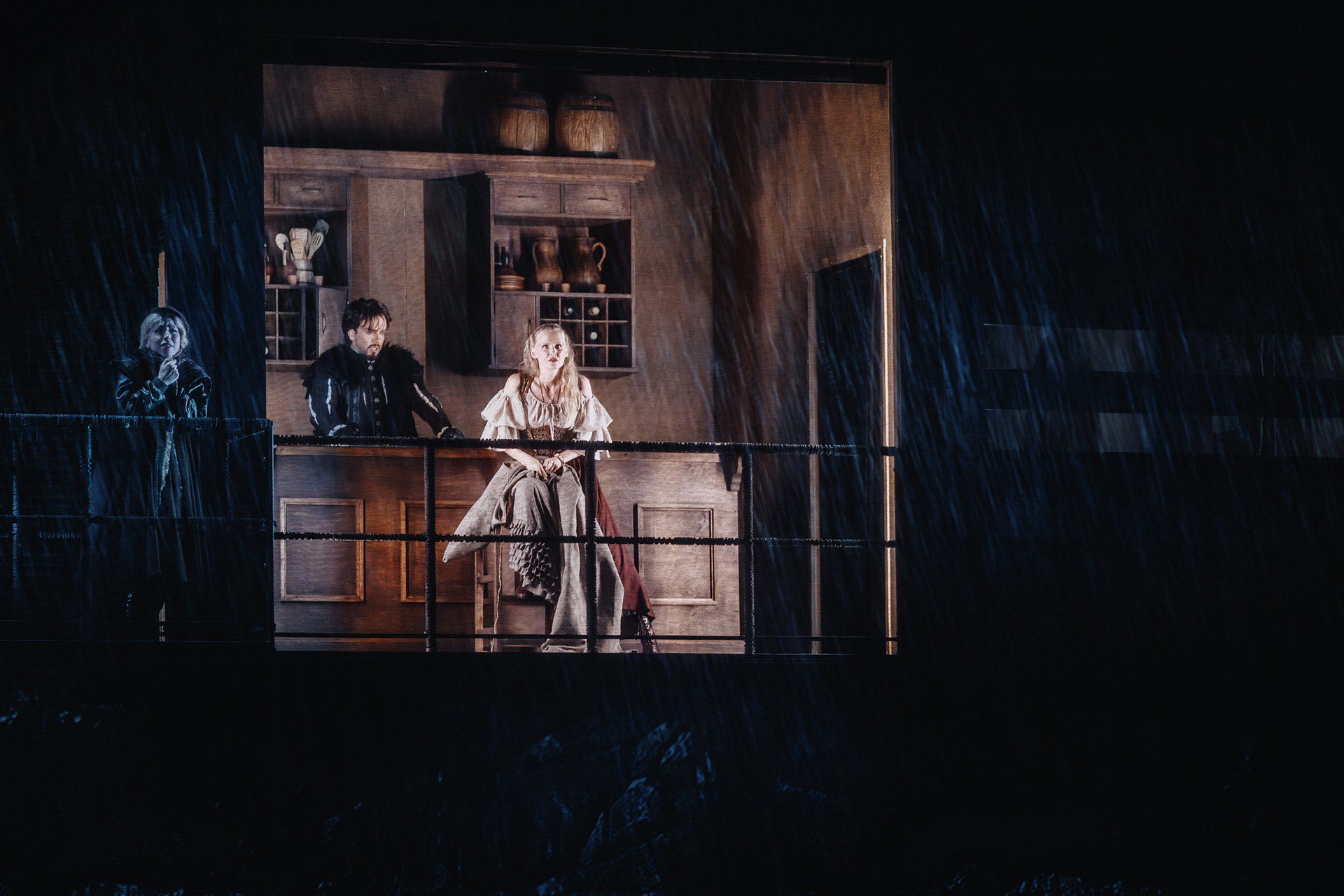 Фокус режиссёра, как и у Верди, — судьба шута. На материале политической сатиры (опера написана по роману Гюго «Король забавляется») Новиков выводит на первый план не памфлет, а человеческую драму. Острый на язык и злорадный на службе шут-горбун дома снимает горб как элемент рабочей формы, беспокоится за дочь и не находит себе места, когда Джильду похищают. В этой двойственности просвечивает романтический раскол героя, но неумолимый рок приближает оперу скорее к греческой трагедии. Верди щедр не только на музыкальный, но и на артистический материал для своих героев. Povero Rigoletto — одна из первых «песен без слов» в опере, достаточно сложная по артистической задаче — в исполнении Константина Сучкова прозвучала настоящей удачей: выразительной и живой.