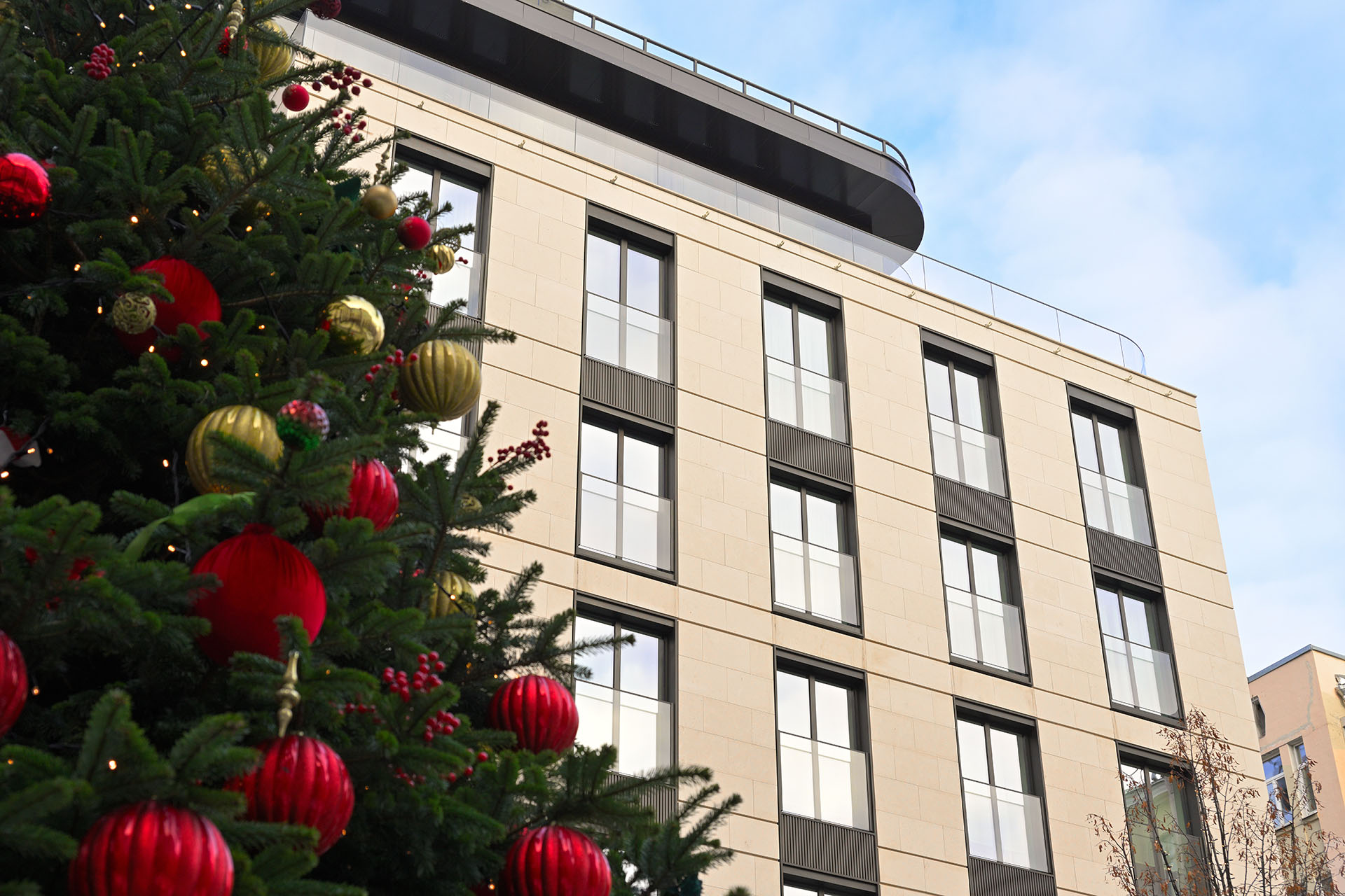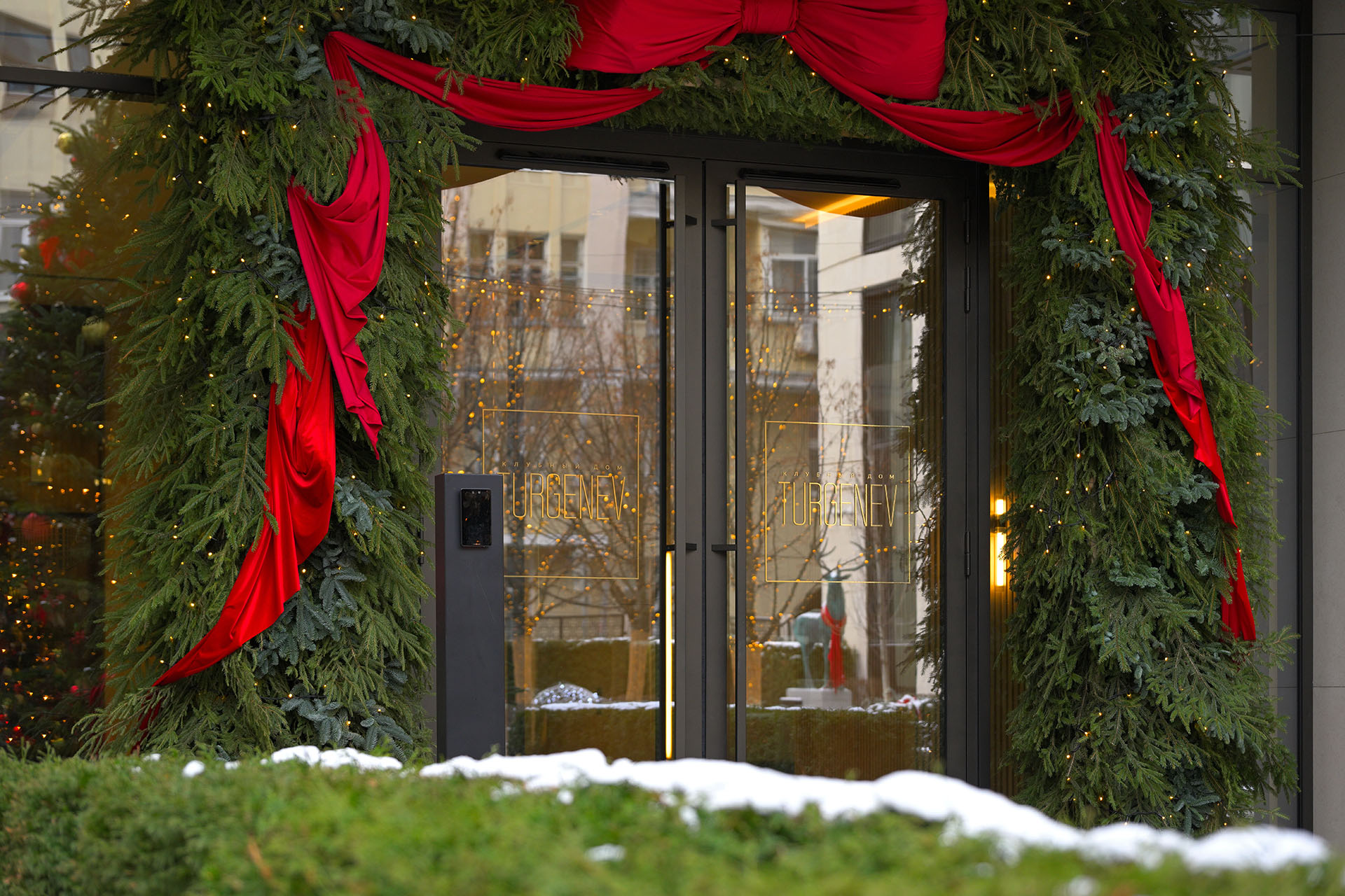 Эта концепция нашла отражение и в клубном доме TURGENEV, внутренний двор которого в декабре превращается в небольшое новогоднее пространство. Центром композиции стала шестиметровая пихта Нордмана, украшенная в благородной красно-золотой гамме. Более пяти километров тёплых гирлянд оплетают не только её, но и перголы, а также кроны 12 лип, создавая эффект мягкого сияния, словно свет спускается сверху. Это отсылка к уютным рождественским площадям Европы, переосмысленная в формате приватного сада.