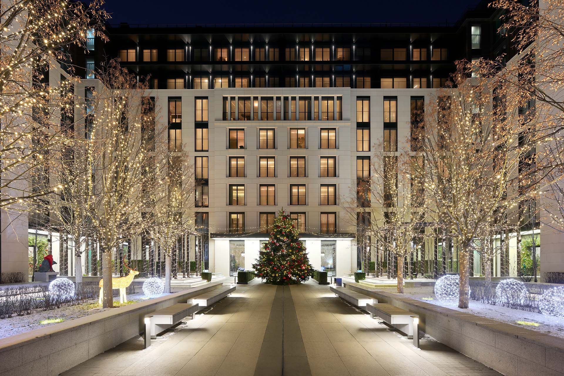 Пространство между деревьями дополняют световые фигуры — благородный олень и объёмные сферы. Особый характер двору придают бронзовые скульптуры, вдохновлённые известными образами оленя из Мюнхена и кабана из Флоренции. Бархатные шарф и шапка добавляют им тёплую, почти человеческую интонацию. Входные группы оформлены как праздничные порталы — арки из живого лапника, гирлянд и алых шаров задают настроение уже при входе. Дверь гранд-лобби украшает объёмный красный бант. Важно, что эта эстетика не обрывается на улице, а органично продолжается внутри: в лобби установлены ёлки и праздничные композиции, выдержанные в единой стилистике.