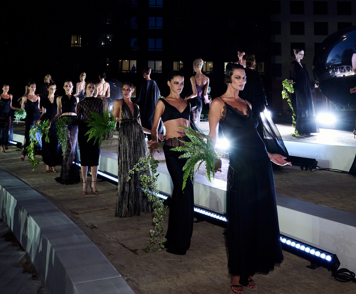 Территория ЖК на время показа превратилась в декорации перформанса: дизайнеры создали искусственный оазис в центре урбанистического ландшафта, а контраст между технологичностью и природой стал метафорой для презентации коллекции.