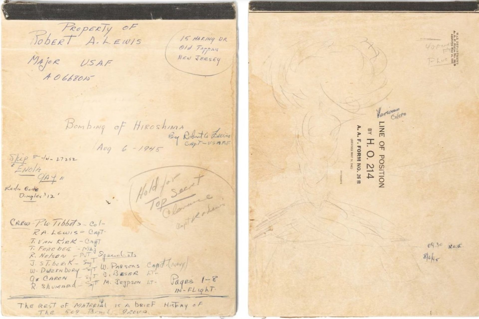 На обложке дневника указано «Собственность Роберта А. Льюиса… Бомбардировка Хиросимы 6 августа 1945 года». Внутри есть запись: «My God, what have we done?» («Боже, что мы наделали?»), сделанная сразу после применения первой атомной бомбы.