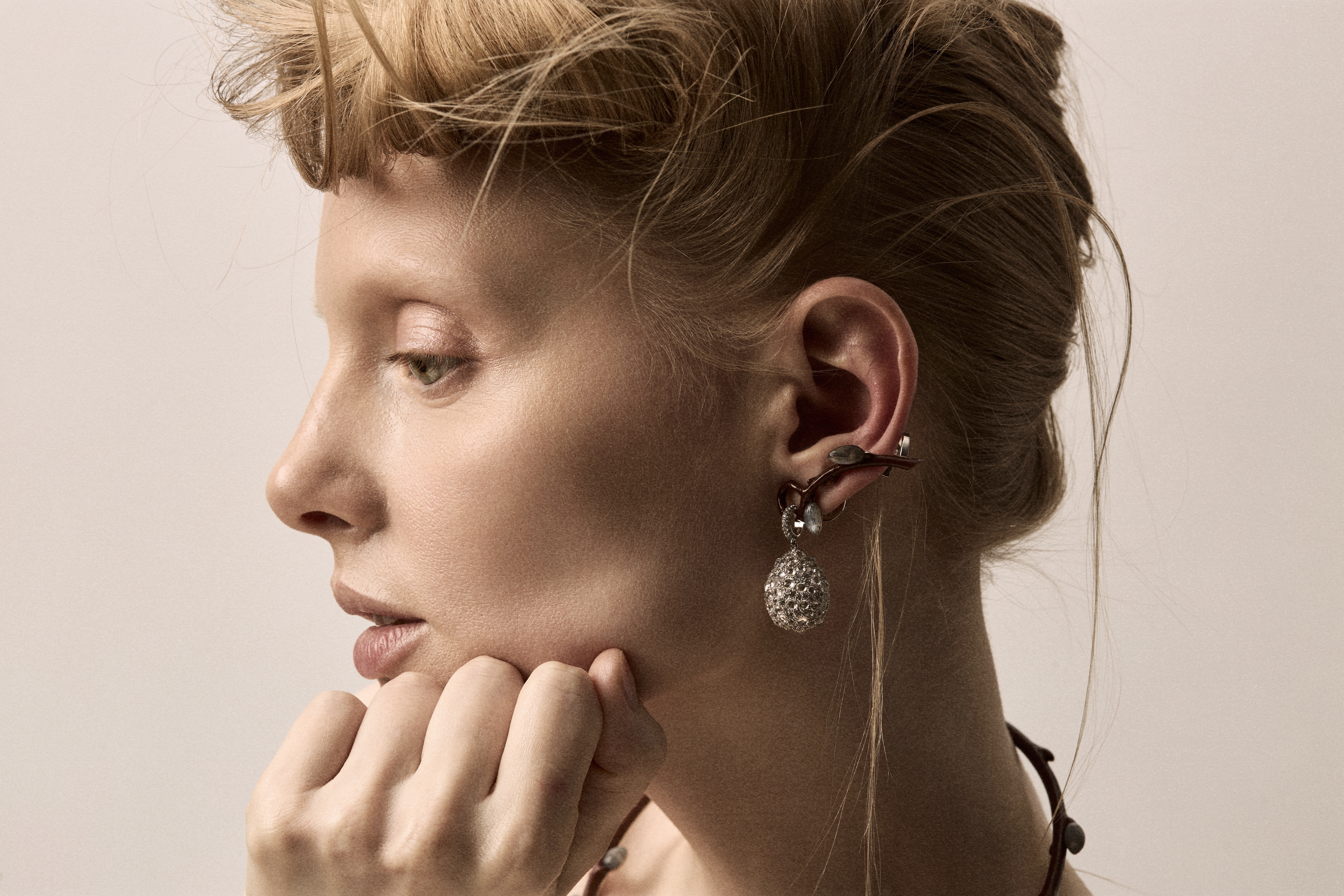 В линейку вошли серьги, колье и кольцо из золота 585-й пробы. Композиция сочетает украшения в виде веток и почек, сделанные из сердолика и лабрадорита и формирующие подвижный, почти органический силуэт. Дополняют изделия съёмные подвески в форме яиц с сапфирами в огранке «роза» — благодаря им украшения можно сочетать как с повседневными, так и вечерними образами.