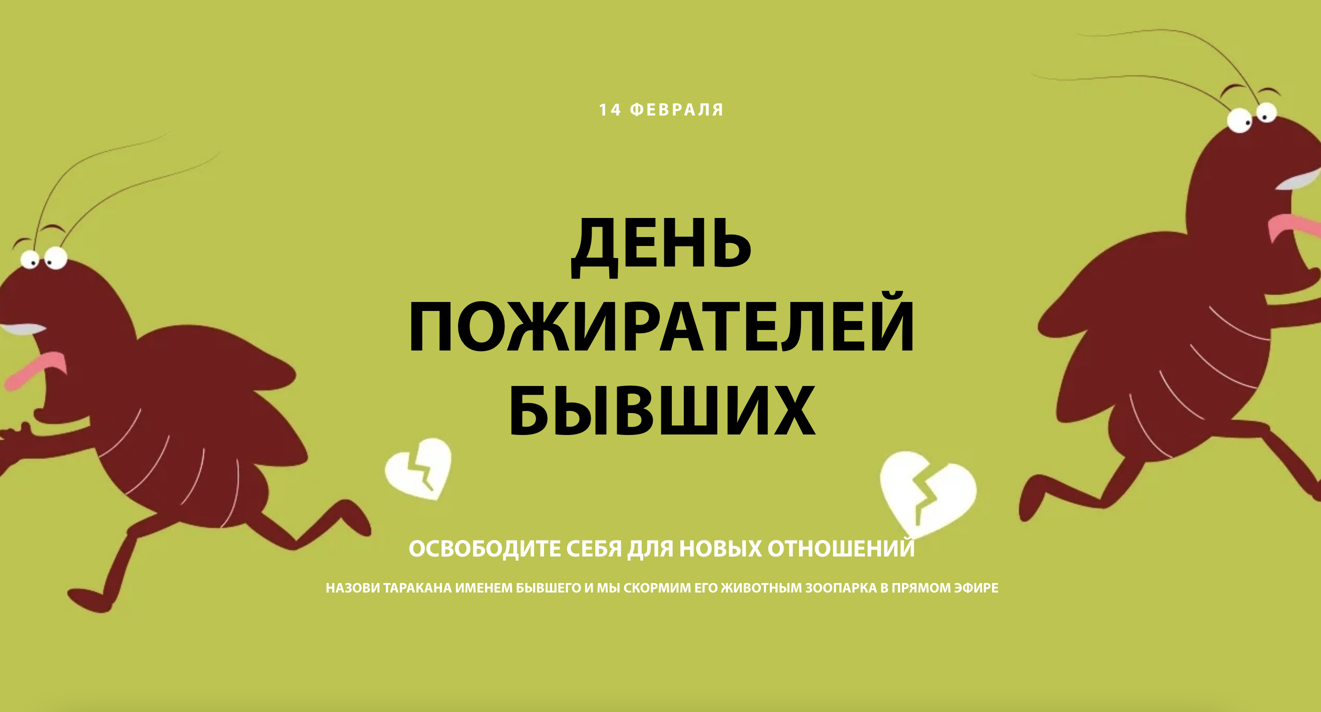 Любой желающий может «скормить» бывшего возлюбленного животным. По задумке организаторов, участники акции должны назвать тараканов именами своих бывших. Затем сотрудники зоопарка скормят насекомое плотоядным животным, рыбам и сурикатам, в прямом эфире в инстаграме. Слоган акции призывает «освободить себя для новых отношений».