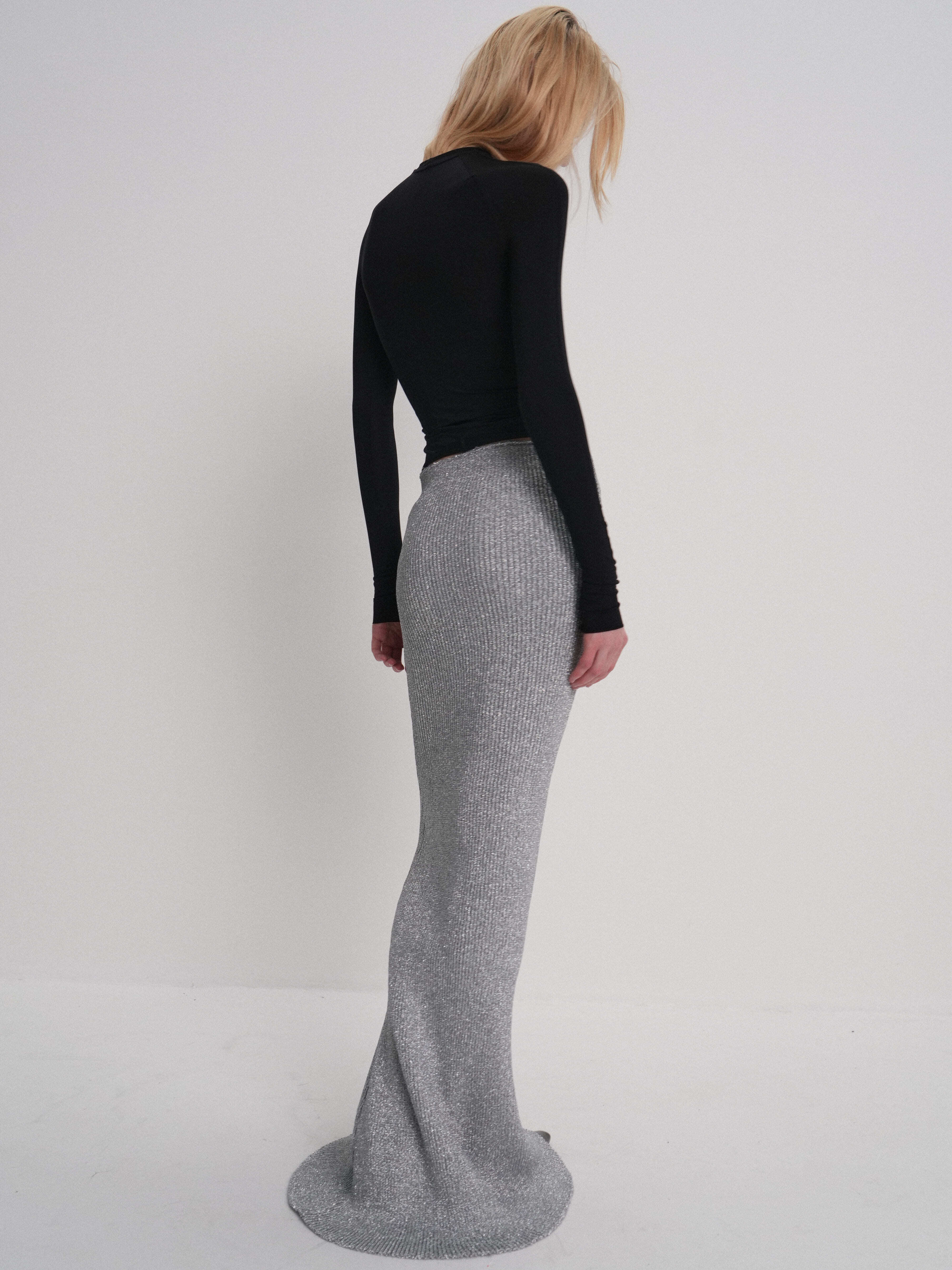 Для коллекции использованы разные по структуре материалы — от мягкого тенсела до плотного футера, сохраняющего форму. Связующим элементом с предыдущими проектами Карцева стала серебряная вязаная юбка, перекликающаяся с его ювелирной линией.