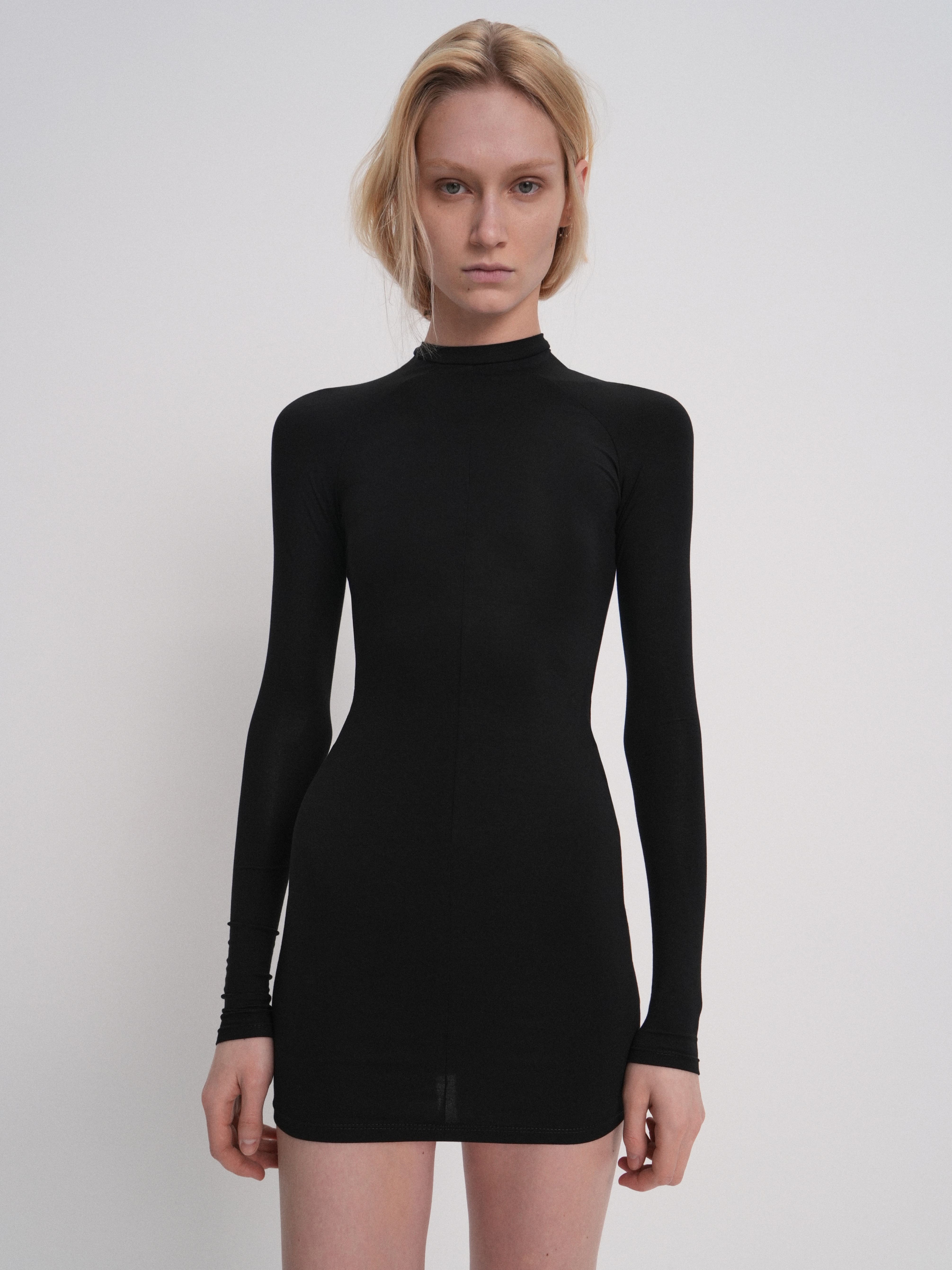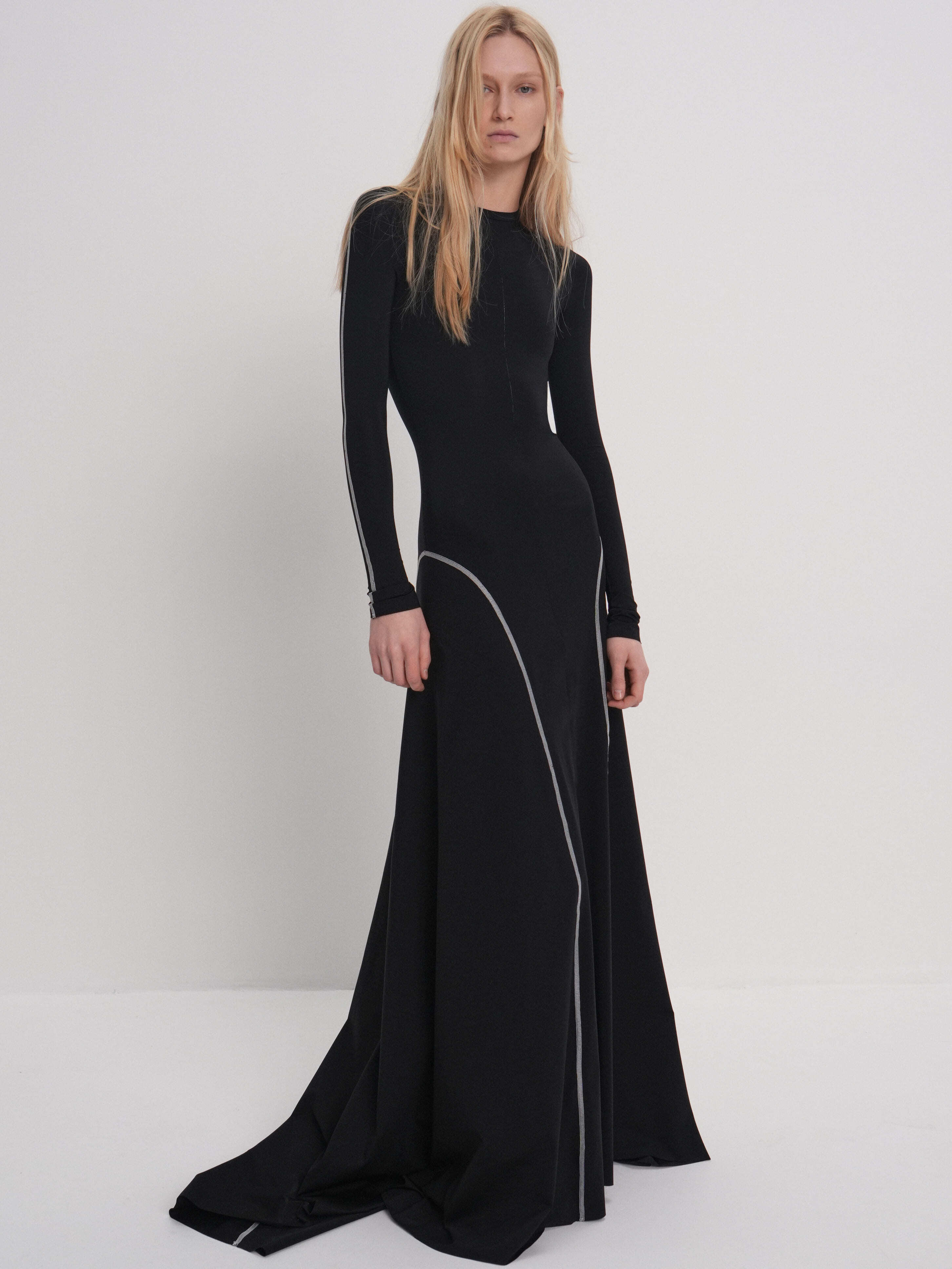 Среди ключевых элементов — цельнокроеные водолазки без горизонтальных швов, лонгсливы из плотного бифлекса с бандажным эффектом, а также удлинённые силуэты с акцентом на вытянутые линии. Важной деталью становятся плоские швы, которые не скрываются, а, напротив, подчеркивают линии тела.