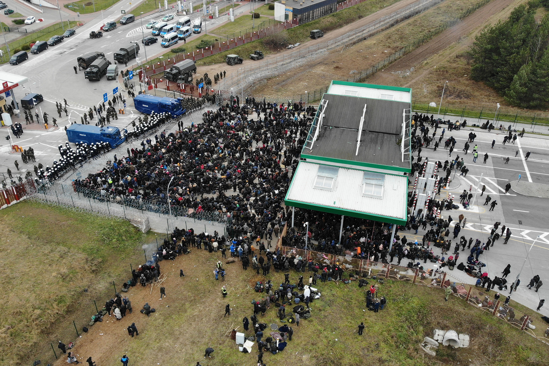 Днем польские власти стянули к погранпереходу дополнительные силы полиции. СМИ пишут, что «переговоры» с белорусской стороной силовики теперь ведут через громкоговорители — женский голос из них призывает:
