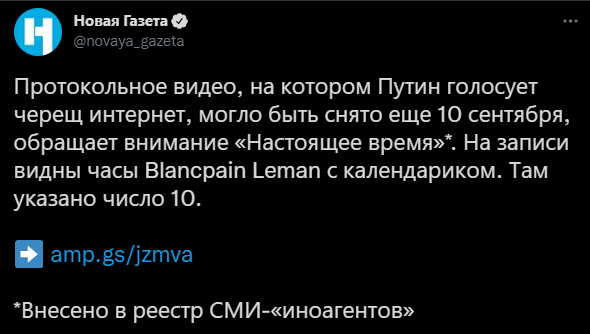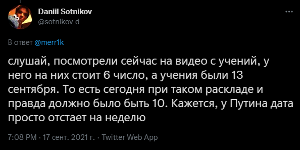 Другие решили, что дата действительно отстает. Об этом 17 сентября рассказал журналист «Дождя»* — он посмотрел репортаж, записанный с полигона в Нижегородской области, и снова заметил несовпадение. Вместо 13 сентября часы Путина показывали 6-е.