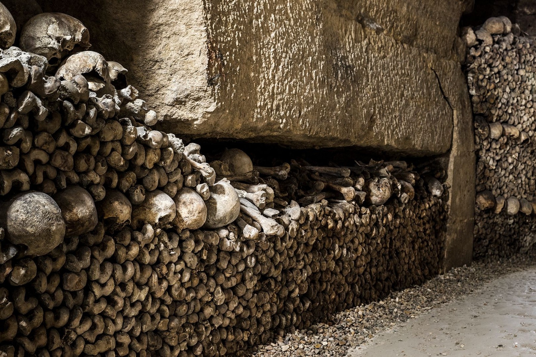 Катакомбы появились в конце XVIII века. Чтобы решить проблемы с переполненностью парижских кладбищ, в штольни на глубине около 20 метров перенесли останки 6 млн человек. Туристам доступна часть галерей длиной 1,7 км, где кости уложены в стены.