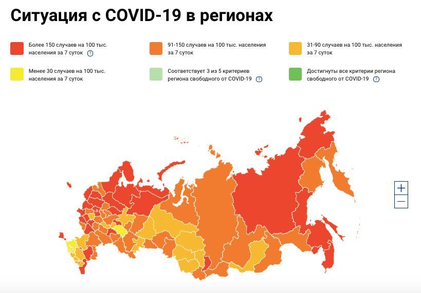 Вместе с данными о вакцинации населения на портале появилась «тепловая карта», описывающая ситуацию с коронавирусом в каждом регионе. Он может быть окрашен цветами от зеленого до красного, где зеленый значит «свободный от COVID-19», а красный — нет. Цвет выбирают по пяти критериями: заболеваемость COVID-19 на 100 тысяч населения, охват тестированием на коронавирус на те же 100 тысяч, уровень коллективного иммунитета, занятость коек с аппаратами искусственной вентиляции легких и загруженность коечного фонда пациентами с COVID-19.