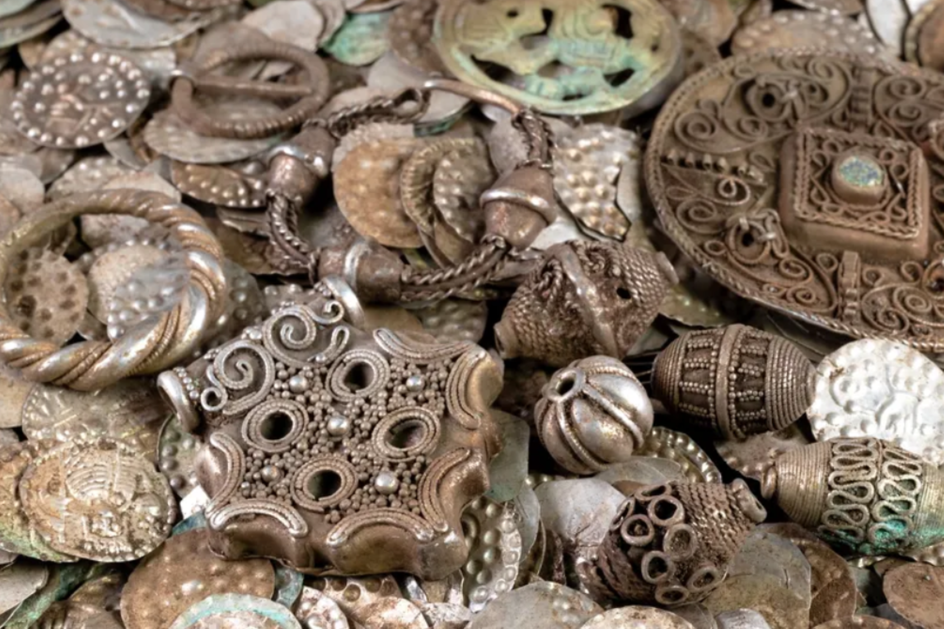 Среди обнаруженных предметов были жемчуг, несколько подвесок, серебряные кольца и приблизительно 20 тысяч монет из серебра. Мужчина уведомил о своей находке местную администрацию, следуя требованиям законодательства.