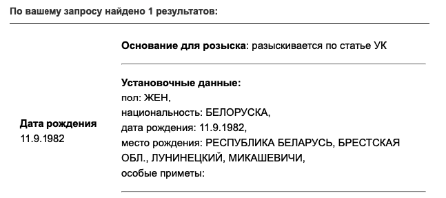 Основанием для розыска в базе указывается: «разыскивается по статье УК». Других подробностей МВД не приводит. По данным Baza, в Белоруссии Тихановскую обвиняют по 361-й статье «Призывы к действиям, направленным на причинение вреда национальной безопасности».