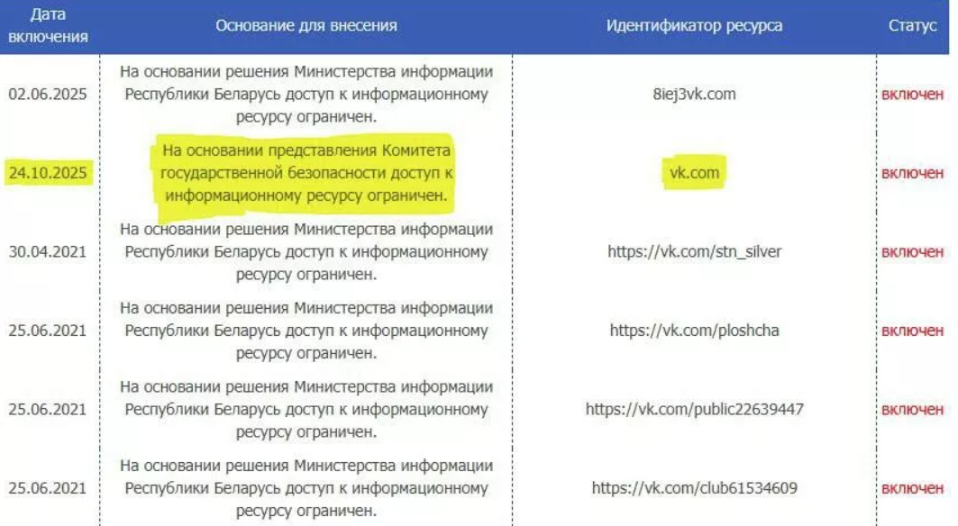 «ВК» оказался в списке ограниченного доступа, который формирует республиканское унитарное предприятие по надзору за электросвязью «БелГИЭ». Интернет-ресурс включили в перечень 24 октября.