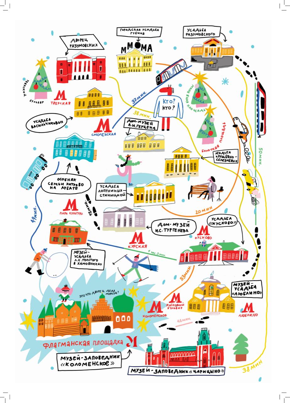«Яндекс Go» и фестиваль «Усадьбы Москвы» выпустили зимний маршрут «Москва Усадебная» по 14 локациями и раскрыли необычные факты каждой. Иллюстрации создал художник Никита Терешин, известный работами с издательствами «Август», «Самокат», «Октопус», «Белая Ворона», «Альпина». Маршруты между особняками на карте подобраны в сервисе «Транспорт» в «Яндекс Go».