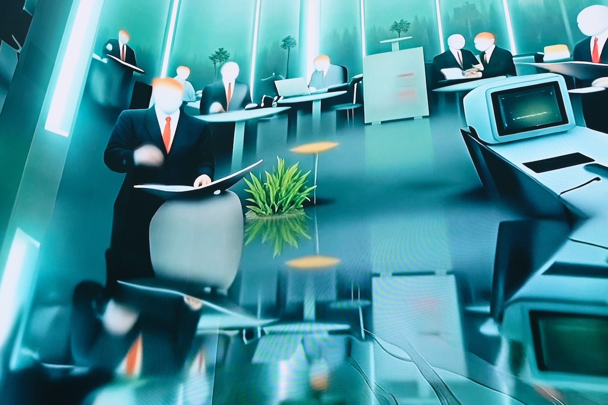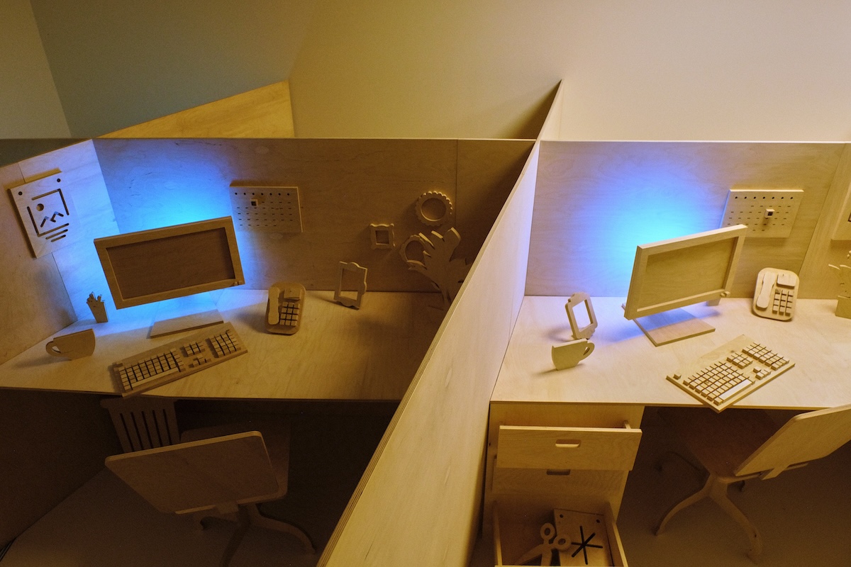 Сама экспозиция выстроена как движение между двумя состояниями. В Белом зале зрителя ждёт инсталляция с обезличенным офисным пространством: фанерная мебель, пустые рабочие места и мерцающий свет создают ощущение мира, в котором человека уже нет, но созданная им инфраструктура продолжает функционировать.