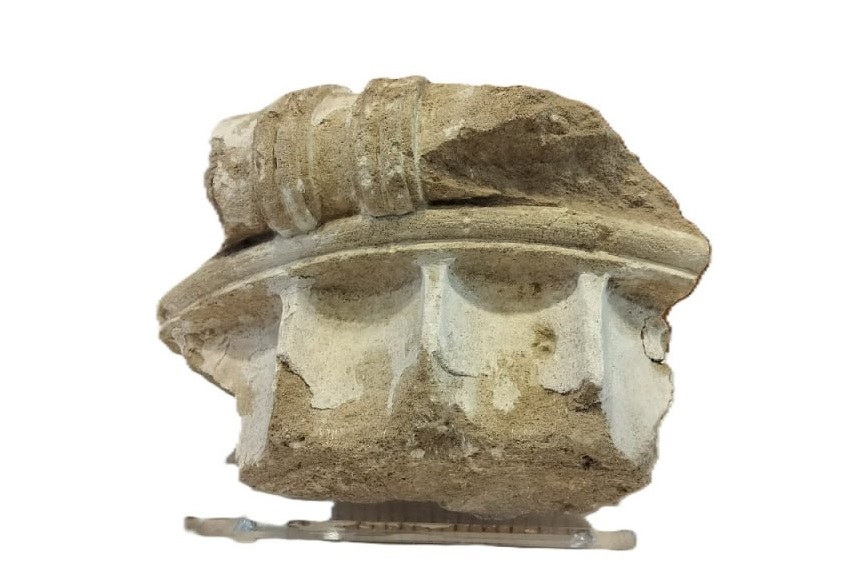 Фрагмент ионической капители колонны выполнен из известняка, местами сохранившего остатки штукатурки. Он достигает 24 см в высоту и 33,5 см в ширину.