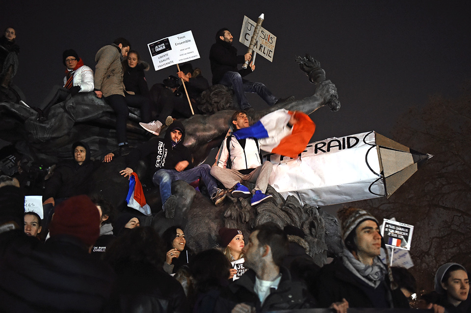 Левый сатирический журнал Charlie Hebdo пытались закрыть несколько раз и дважды — уничтожить: в 2011 году неизвестные подожгли здание редакции. Журналисты высмеивали самый широкий спектр правых и ультраправых взглядов, мишенью их карикатур и фельетонов становились де Голль, Саркози, Путин. Но главным объектом насмешки всегда был религиозный — не только исламский — фанатизм. На фото: митингующие собираются на площади Наций, Париж Фото: Getty Images/Fotobank