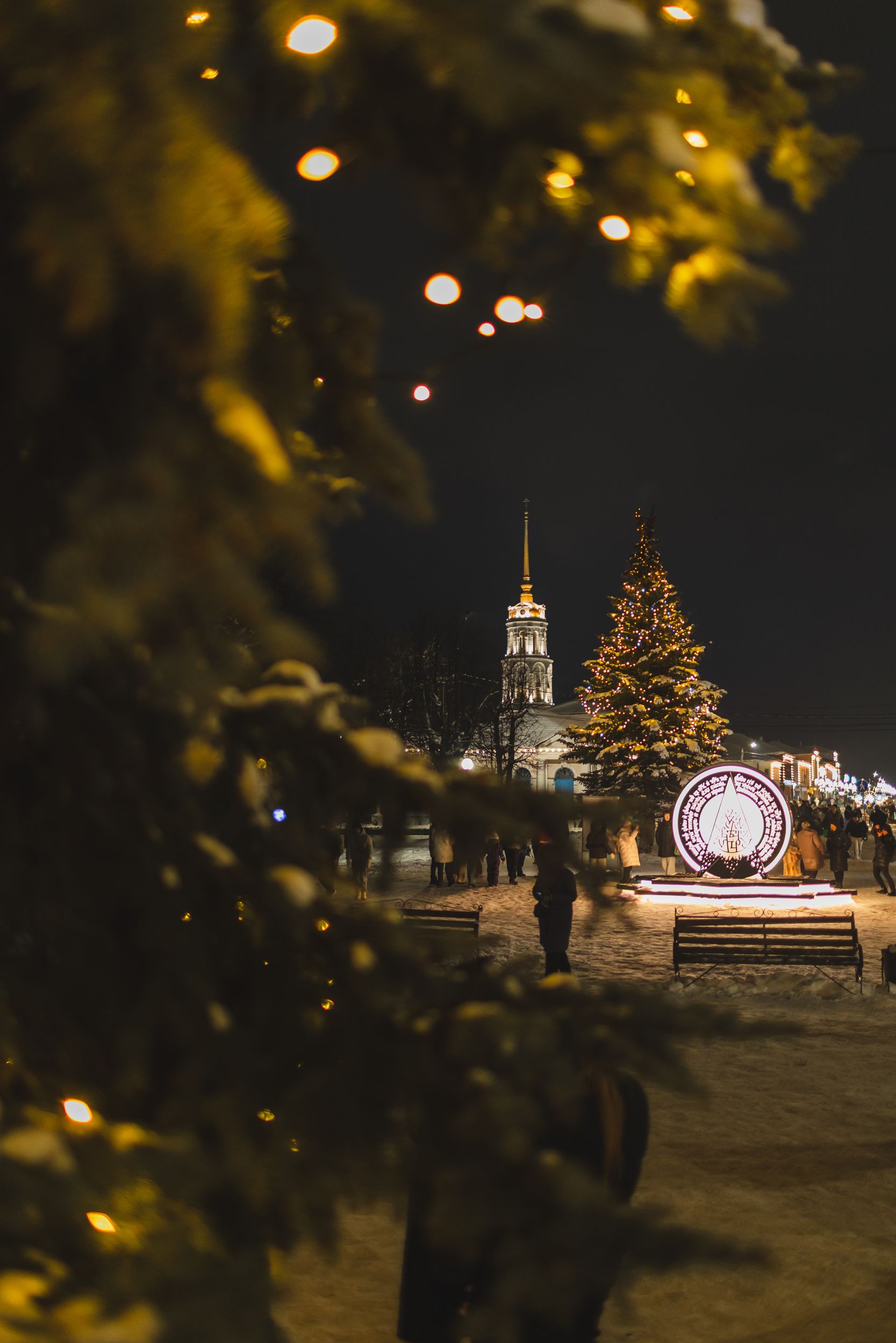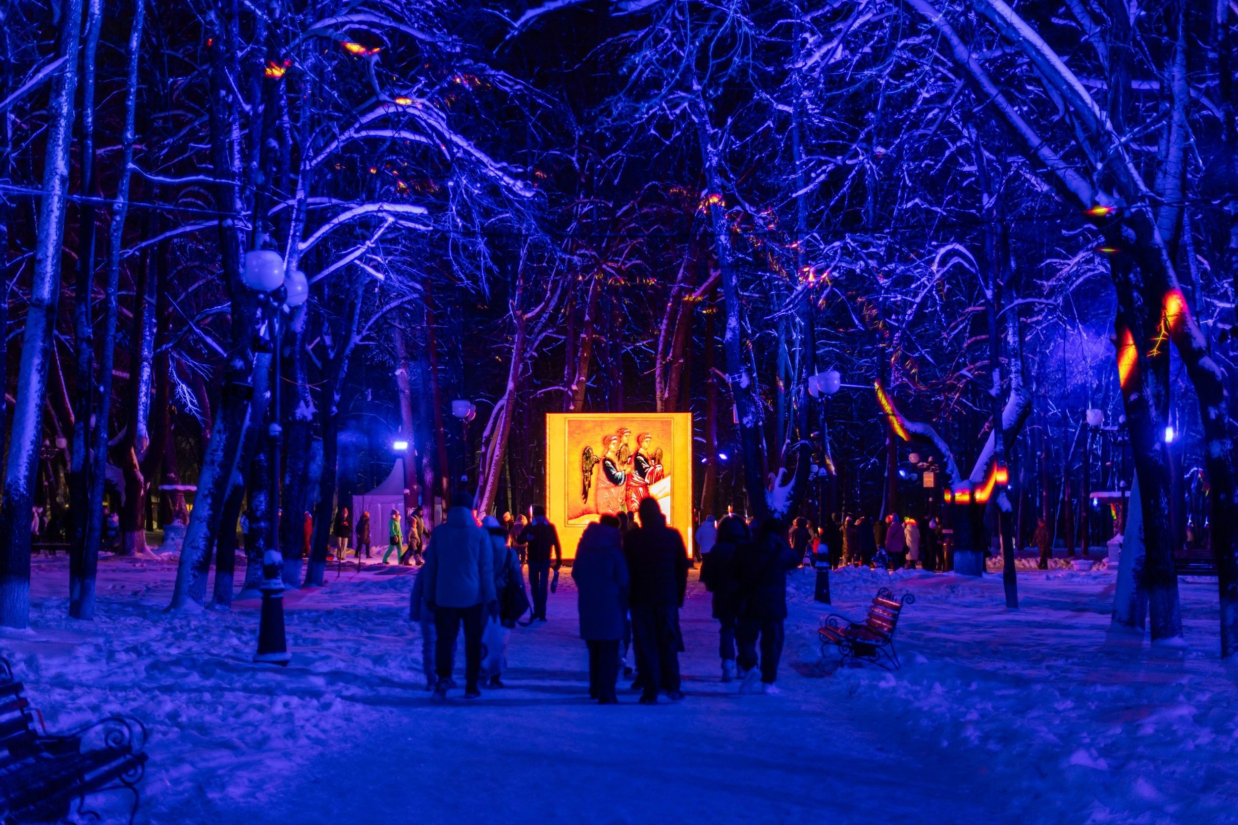 Рядом, на площади Ленина, — инсталляции проекта «ПроХрам». Одна из них — восьмиконечная звезда с каллиграфическим «Азъ есмь Свет миру» с одной стороны и тонким образом Святого Семейства — с другой. Металл, свет и снег складываются в тихую иконографию современного города, где Евангелие написано не только словами, но и светодиодами. Рядом — «Храм», напоминание о Спасе Нерукотворном, разрушенном в 1930‑м; память здесь — не строчка на табличке, а объёмная форма, к которой хочется подойти и постоять молча.