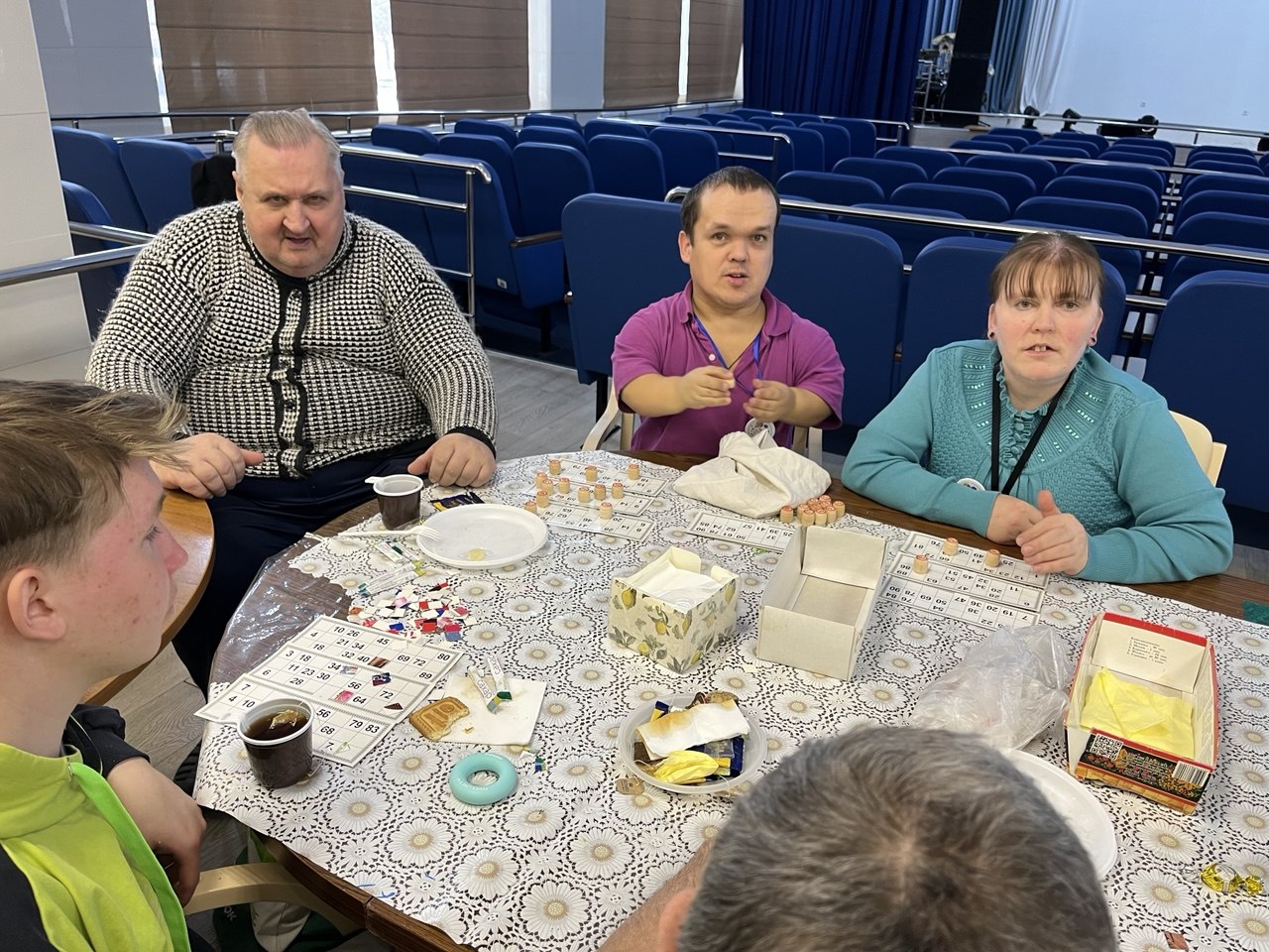 Так как ребята привезли сладости, все с удовольствием решили устроить миничаепитие. Владимир Петрович принес баян, и мы попели советские песни. Потом ребята решили поиграть в лото с нашим молодым подопечным Денисом, ему только 21 год, но он всегда к нам приходит. Елена и Ольга Дмитриевна разукрашивали заготовки с помощниками из «Люблино», остальные беседовали.