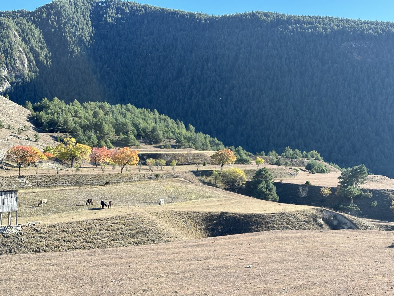 Проезжая по долине, не отрывайте глаз от пейзажей. Это все еще пастораль. Многослойная, многоцветная, перерезанная горизонтальными тенями и линиями от перепадов рельефа, размеченная восклицательными знаками пирамидальных тополей и (если повезет) движущимися точками барашков. Коровы обычно в комплекте — пасутся себе, стоя в профиль дороге. В небе охотятся орлы (соколы, ястребы?), в полях цветут маки и шалфей, но в целом это только разгон, коридорчик, предчувствие встречи.