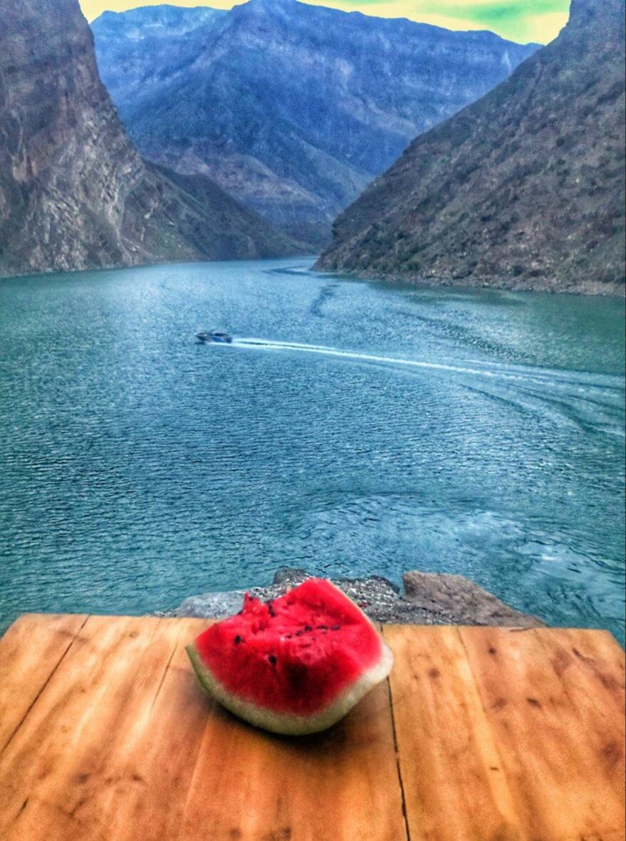 Летом из садов вдоль дорог выносят ведра абрикос, персиков, яблок, вишни, черешни — только с дерева, еще не растерявших запах сада. А вокруг слоистый пейзаж из скал, наползающих друг на друга, по ощущениям — то сдвигающихся, то раздвигающихся, как в кино про пещеру Али Бабы.