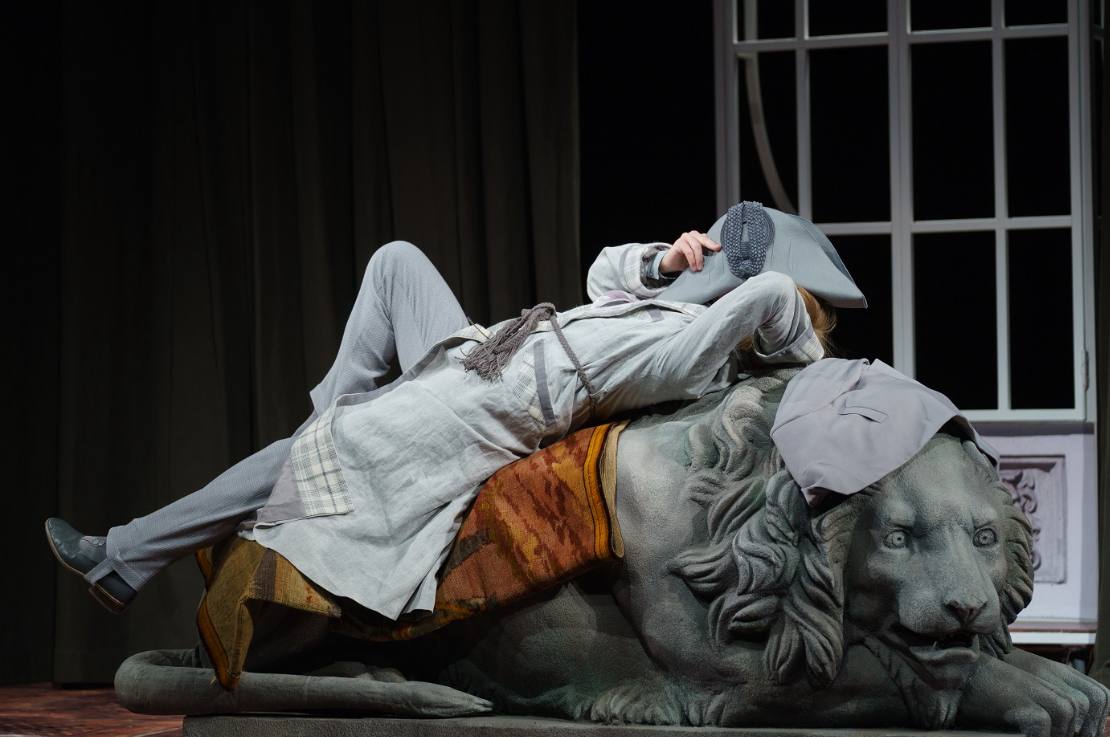 На сцене лежит большой каменный лев.