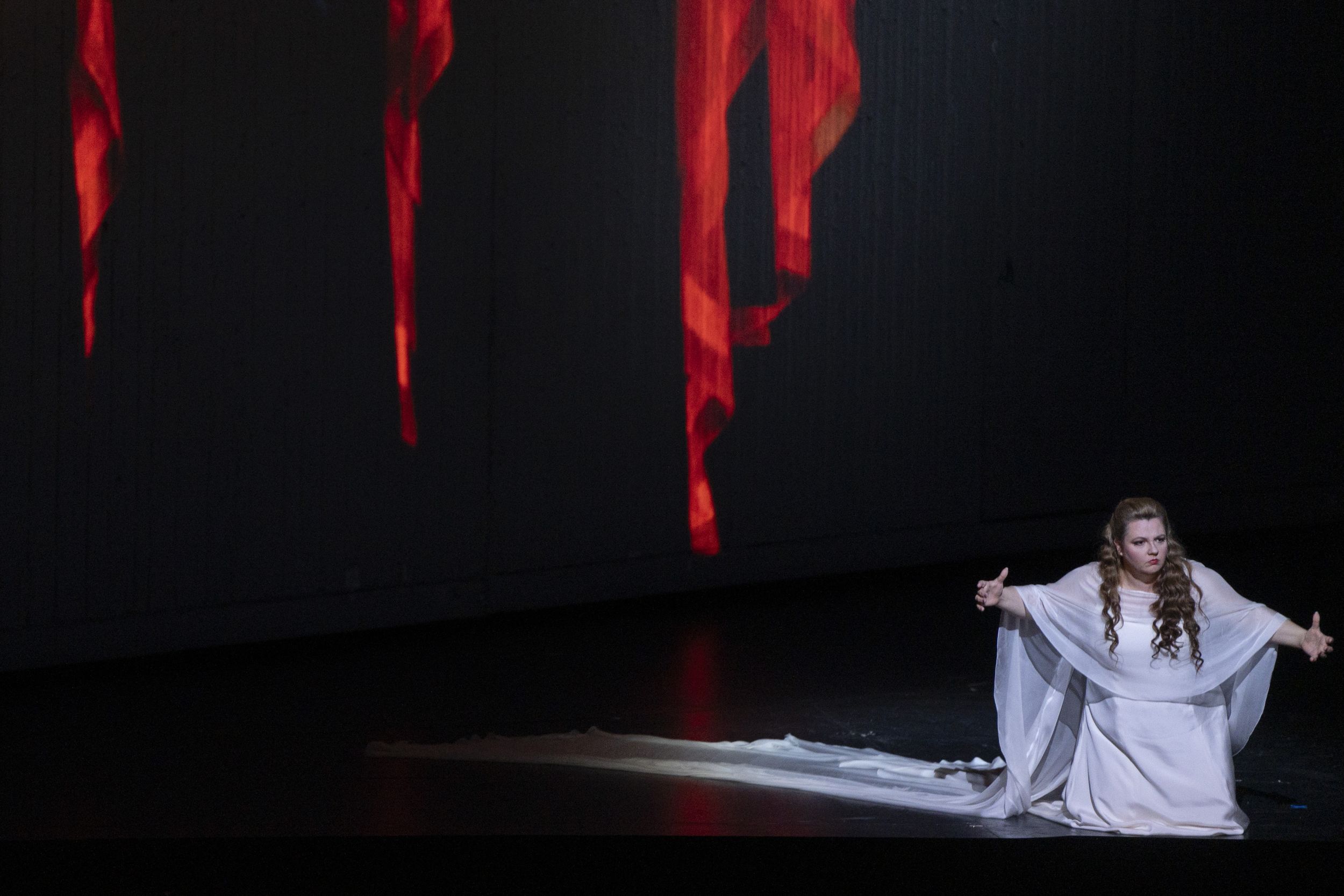 Начну с певцов. Ясное, дело, в «Аиде» нужны первоклассные певцы… Здесь прекрасной певицей явилась исполнительница партии Аиды Александра Курзак… Мы её несколько раз видели в Метрополитен-опере, и она — певица высокого класса. Она была и Виолеттой, и Тоской, и Неддой, и Микаелой… Но Аидой она никогда не была… Но готовилась спеть впервые эту партию в Краковской опере (Польша)… Тут неожиданно вышла из строя певица Ева Плонка, и Александра Курзак стала заменой — и звездой этой постановки.