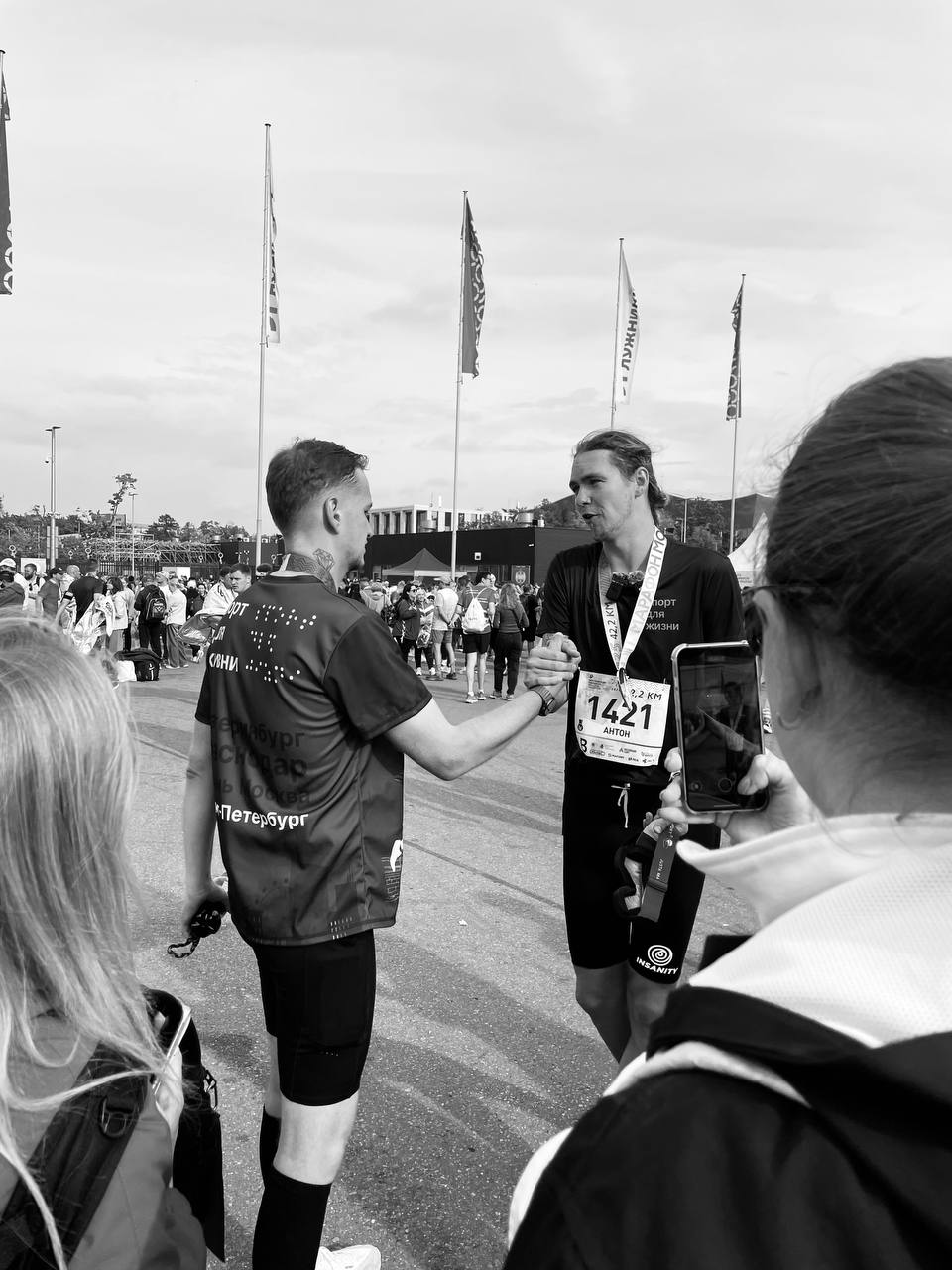 Ребята признаются, что это было серьезным испытанием. Во-первых, оказалось, что не так просто незрячему человеку двигаться в толпе — а тем более бежать. Плотный поток бегунов превратился в опасную реку, лавировать в ней человек без зрения в одиночку не может. Вот тут и включаются лидерские качества волонтера-сопровождающего, который ведет такого незрячего атлета. Нужна максимальная сосредоточенность, ответственность, чтобы порой буквально расчищать перед собой дорогу. В какой-то момент Антон упал: тандем не успел вовремя затормозить перед бегуном, который внезапно остановился впереди них. И этот опыт тоже был необходим: стало еще раз понятно, насколько сложно порой незрячему или слабовидящему человеку ориентироваться в пространстве, и как важна реакция тех, кто рядом, их внимание.