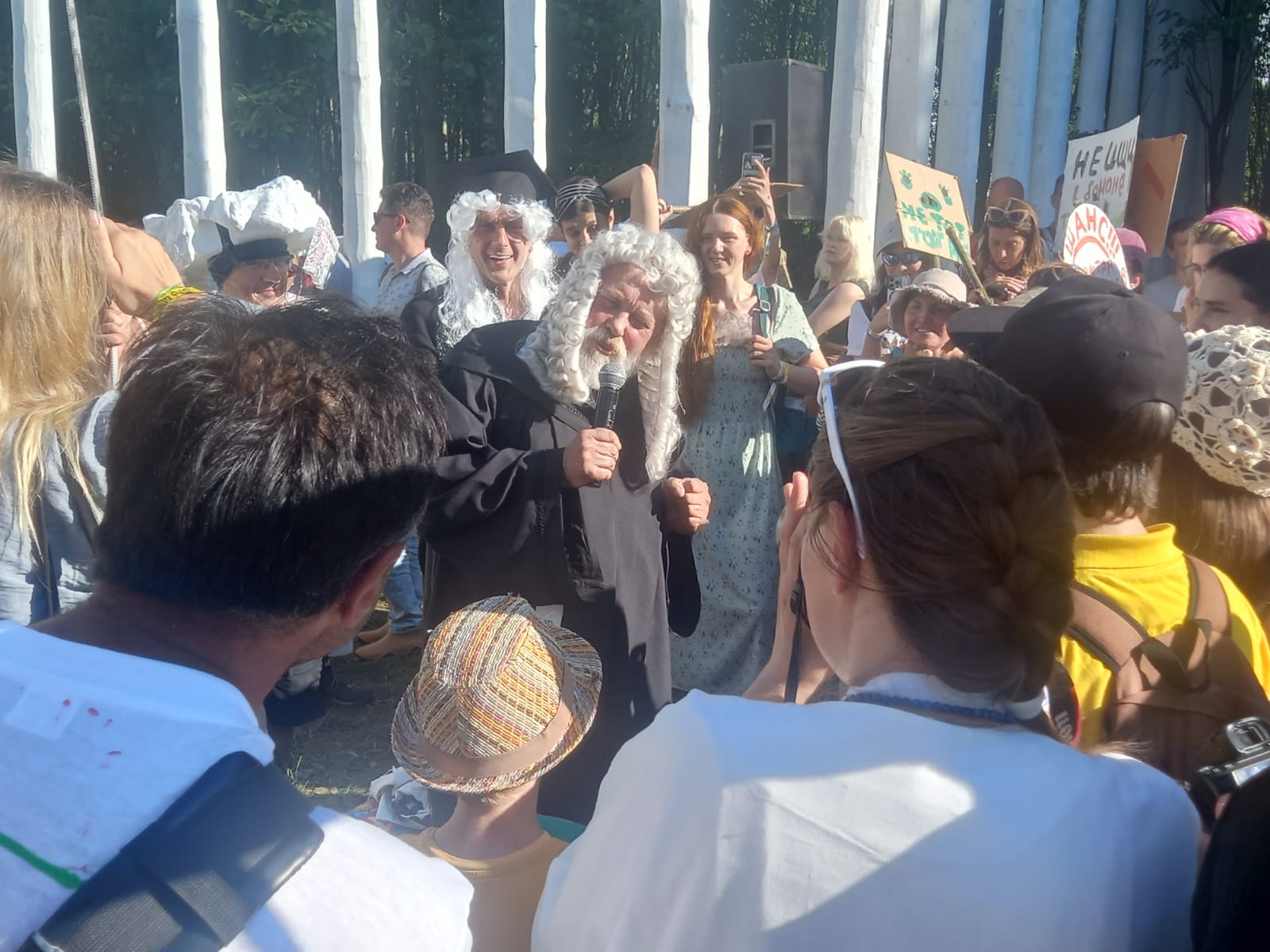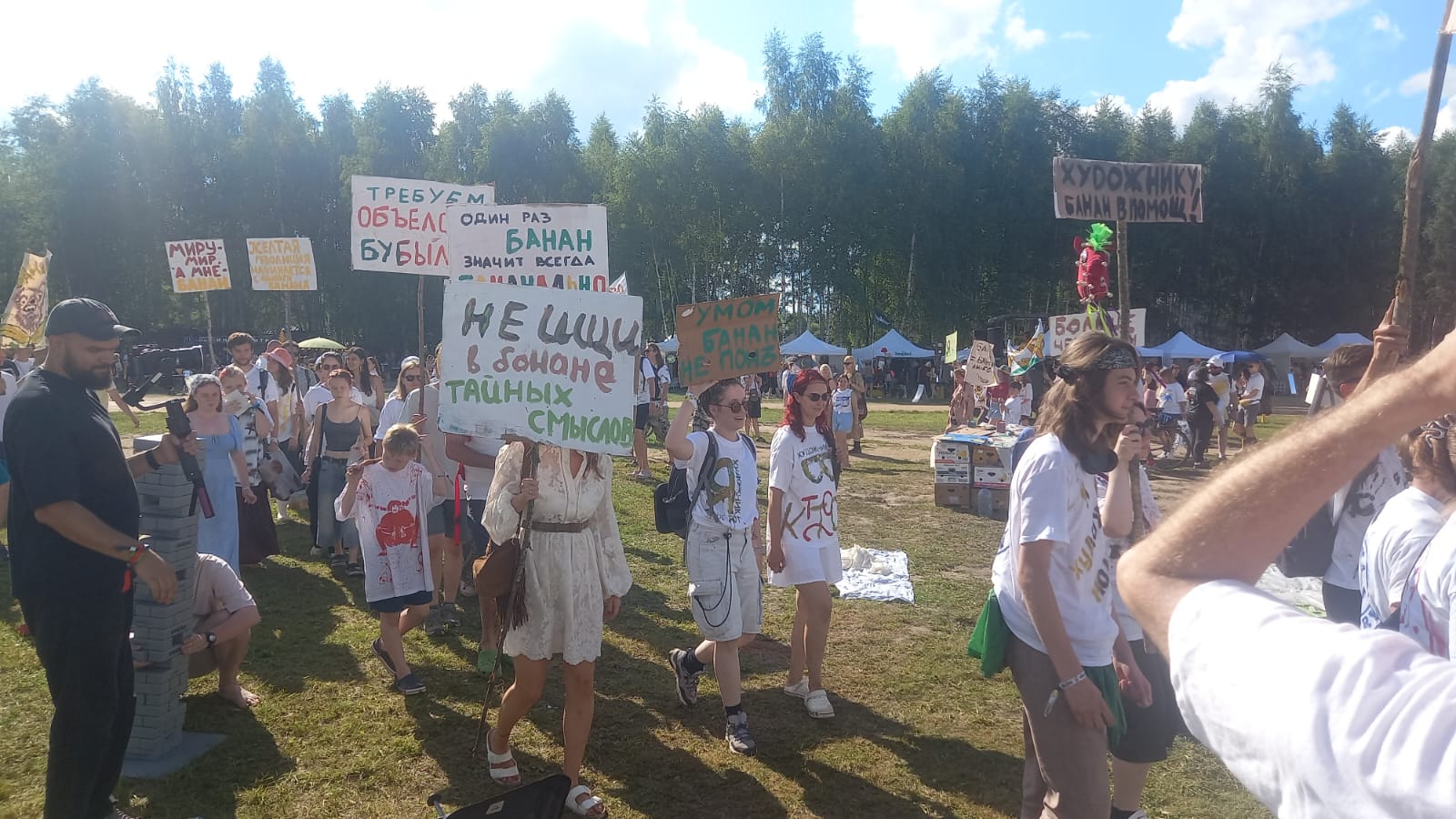 На площади прошла «церемония банановой надежды» — заседание суда, где в роли судьи в парике выступил основатель арт-парка Николай Полисский. В итоге суд оправдал всех отвергнутых «Архстоянием» художников и обещал их творениям реабилитацию, правда, не совсем понятно, в какой форме. Сам Николай Полисский сказал, что видит решение проблемы в создании на огромных пространствах нашей страны как можно больше новых парков, подобных Никола-Ленивцу — и тогда каждому художнику найдется место для его арт-объекта.