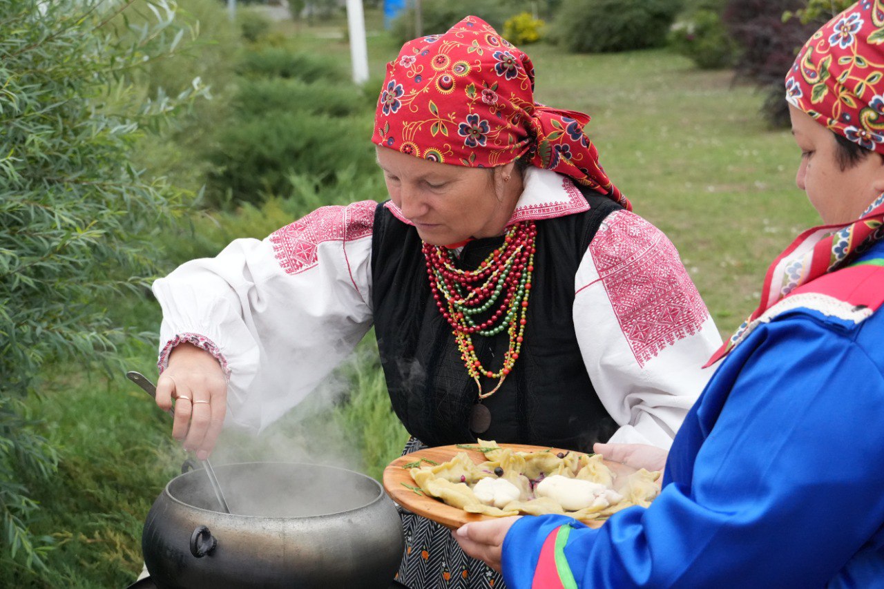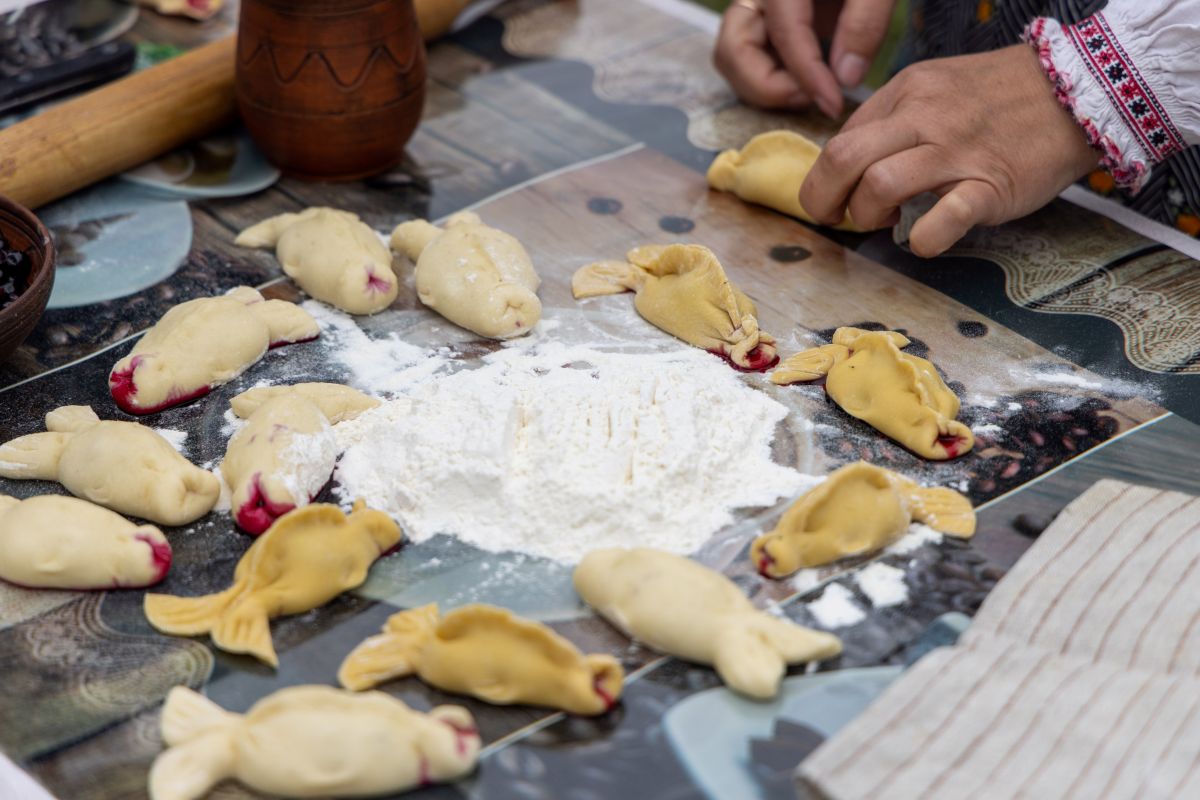 Участницы фольклорного коллектива сохранили не только одежду и песни, но и традиционные для села угощения — вареники со смородиной в виде рыбок, пироги, наливочки и компоты.