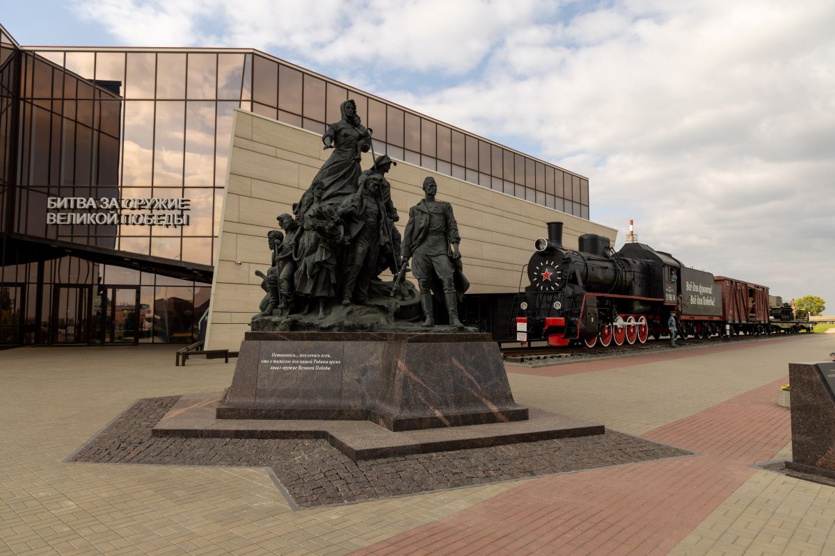 У входа в музей стоит железнодорожный состав, на котором написано: «Всё для фронта! Всё для Победы!». Железнодорожники сыграли ключевую роль в достижении Победы. Они обеспечили эвакуацию и сохранение большинства производственных мощностей, спасли миллионы людей от попадания в плен к немцам. Благодаря их усилиям 17 миллионов человек были вывезены в безопасные районы, а фронт получил всё необходимое: технику, боеприпасы и топливо.
